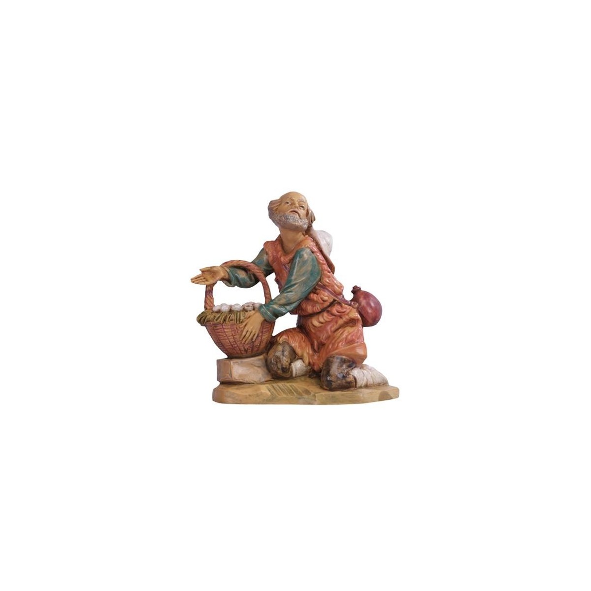 Pastor kneeling with a basket of 6.5 cm Fontanini painted hand-painted eggs. The statues of the traditional Fontanini preseps have expressive and well-refinished faces in the details.