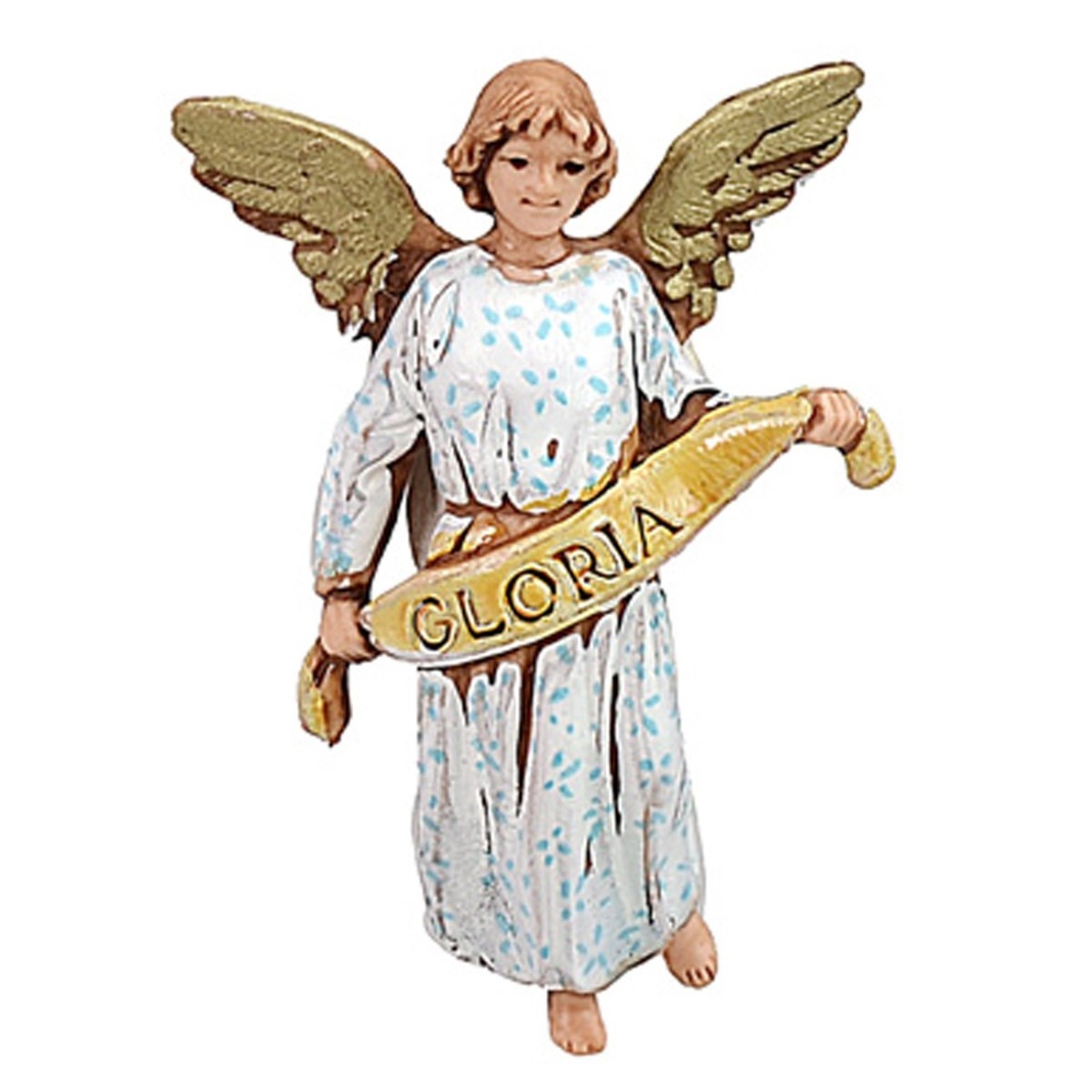 Angel with golden wings holding the festoon with the word Gloria in his hands, the nativity scene statue is part of the Landi Moranduzzo Costumes Storici 6.5 cm series. The other subjects of the Holy Family are available in the related products below the table. Article produced and painted entirely in Italy.