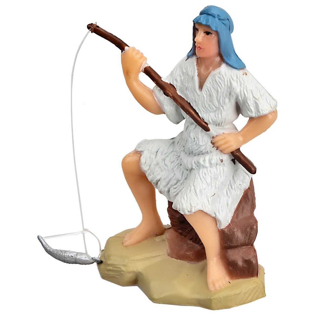 The figurine depicts a seated man with a fishing rod and hanging fish, crafted with detailed features and vibrant colors. An ideal character to enrich river or lake scenes in the nativity scene.