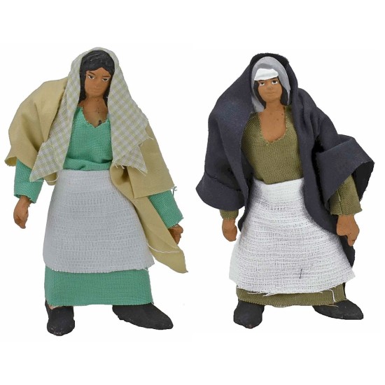 Series 11-12 cm jointed terracotta woman dressed in fabric clothes. The statue is in the standing position with one arm predisposed to move up/down and the bust jointed, it can be used fixed and placed in the desired position. Given its characteristics, it is ideal for creating movements for the DIY nativity scene such as: the woman who beats the clothes, a peasant woman who feeds the hens, a seller, etc. The item is made entirely by hand, therefore, the colors may vary from the photo.