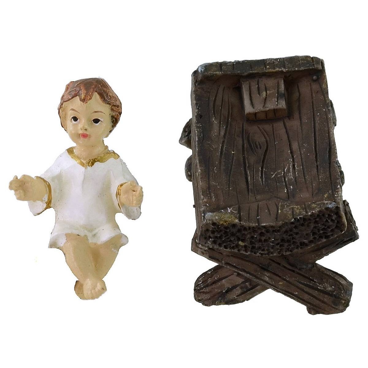 Natività in resina cm 10, composta da San Giuseppe con cappello e lanterna ,Madonna seduta e bambinello nella culla, si fa presente che il bambino non è attaccato alla culla.