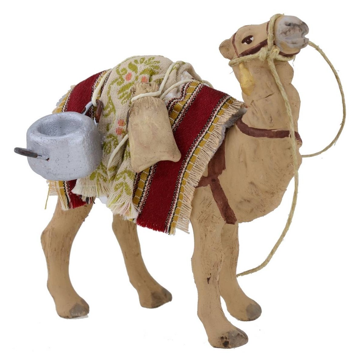 Cammelliere con dromedario carico di oggetti (anfore, pentola, lanterna e sacco). La statua è in terracotta ben rifinita nei minimi particolari con vestiti in tessuto indurito, essendo realizzati completamente a mano possono variare leggermente i colori dei vestiti e del viso rispetto alla foto. Prodotti artigianali realizzati dai migliori artisti italiani.