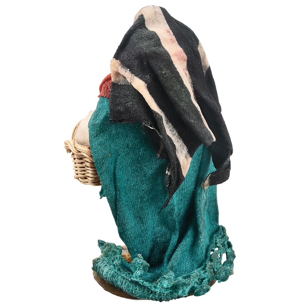Peasant woman in terracotta with a height of 10 cm, dressed in hardened fabric clothes, depicted with a basket of eggs in hand.