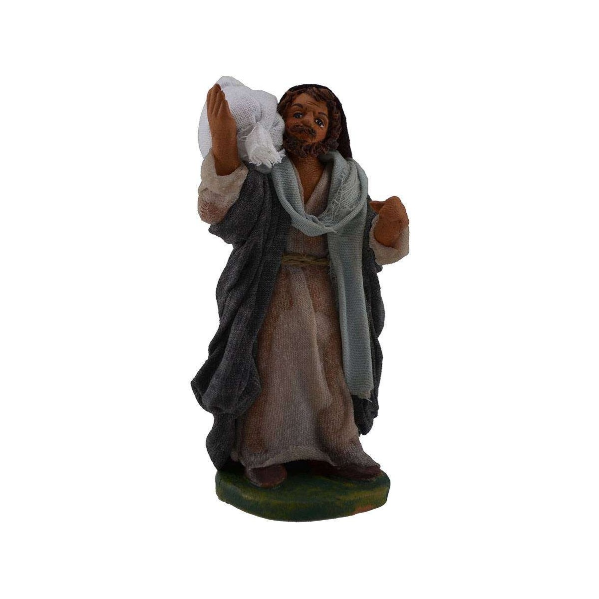 The figurine depicts a standing man holding a bag on his shoulder, with a face detailed in the features and clothing made from hardened fabrics applied to the figure.