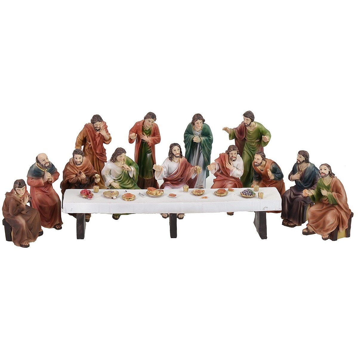 Set di 13 personaggi Pasquali per la rappresentazione dell'Ultima Cena. Possiamo distinguere Gesù, al centro della tavola, dai 12 Apostoli al suo fianco. In questa scenografia Gesù ebbe la sua ultima cena nel luogo detto il "Cenacolo" durante la Pasqua ebraica, precedente la sua morte. Il tavolo della scena risulta essere anch'esso in resina ed è molto caratteristico per le minuterie che lo riempiono e decorano. Le statue della medesima serie hanno volti espressivi e ben rifiniti nei dettagli e sono realizzate interamente in resina. Il prodotto è ideale per la creazione di composizioni Pasquali come Diorami e Presepi.