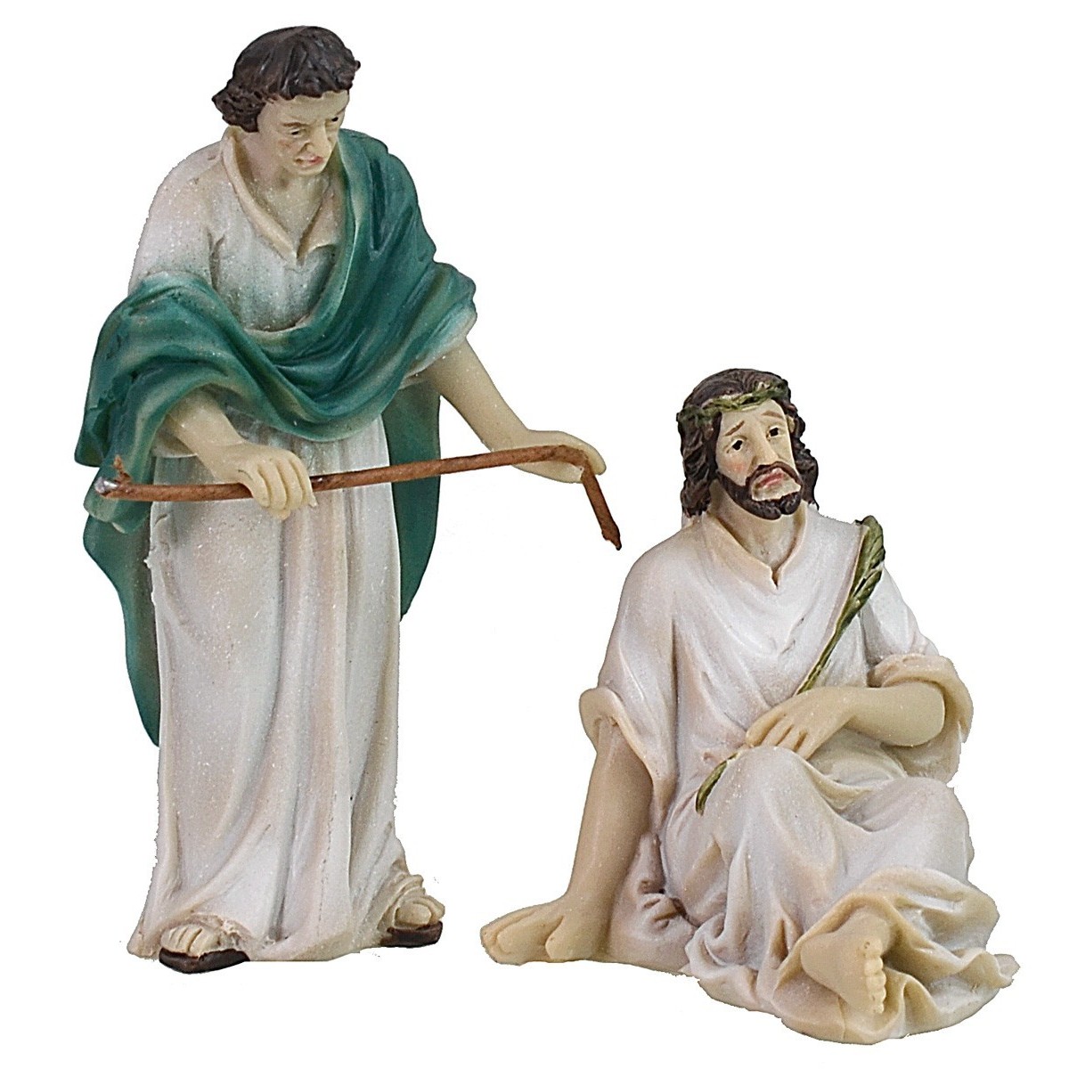 Set of 5 Easter statues for the representation of the coronation of Jesus' Thorns, shortly before his death sentence, at the hands of Roman soldiers. The soldiers amused themselves by humiliating him, placing a crown entwined with thorns on his head, and subsequently, dressing him in a purple cloak, making fun of the condemned by staging the mocking adoration of a king. Episode from the life of Jesus. The statues of the same series have expressive faces and well finished in detail and are made entirely of resin. The product is ideal for creating Easter compositions such as Dioramas and Nativity scenes.