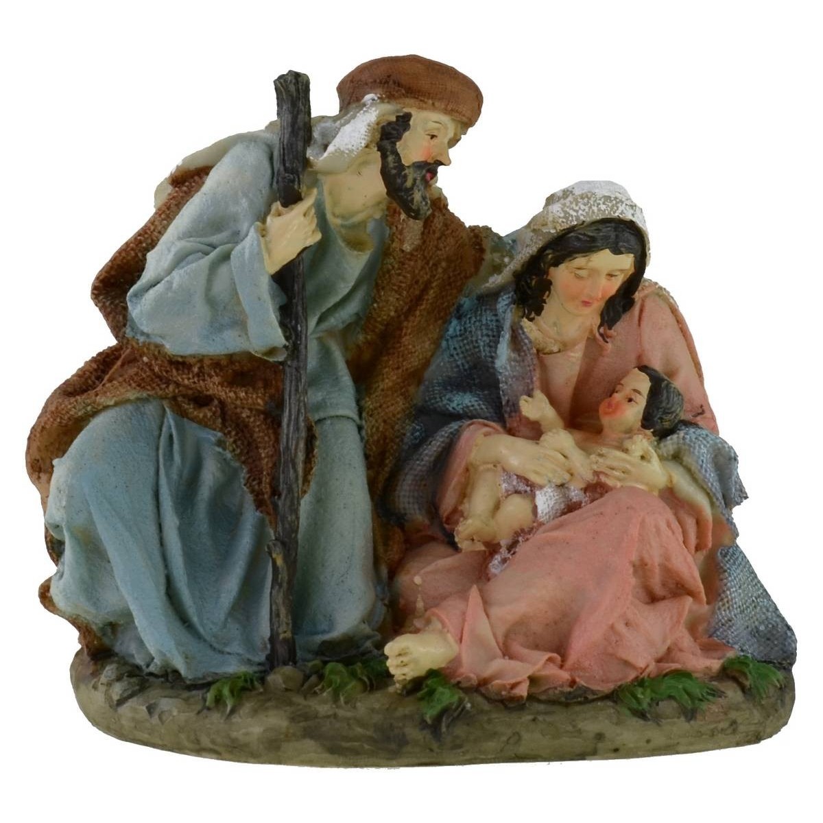 Natività in statua unica composta da San Giuseppe in ginocchio e dalla Madonna seduta con Bambino tra le braccia. La composizione in resina è ben rifinita da far apparire gli abiti dei personaggi quasi reali.