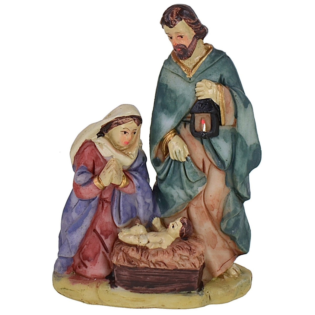 Sacra famiglia in resina dipinta a mano altezza 10 cm comprendente San Giuseppe, Madonna e Gesù bambino. San Giuseppe tiene nella mano sinistra una lanterna e nella mano destra il mantello, alla sua destra vi è Maria inginocchiata a mani giunte con lo sguardo rivolto al bambinello nella culla, la Natività è prodotta in resina.