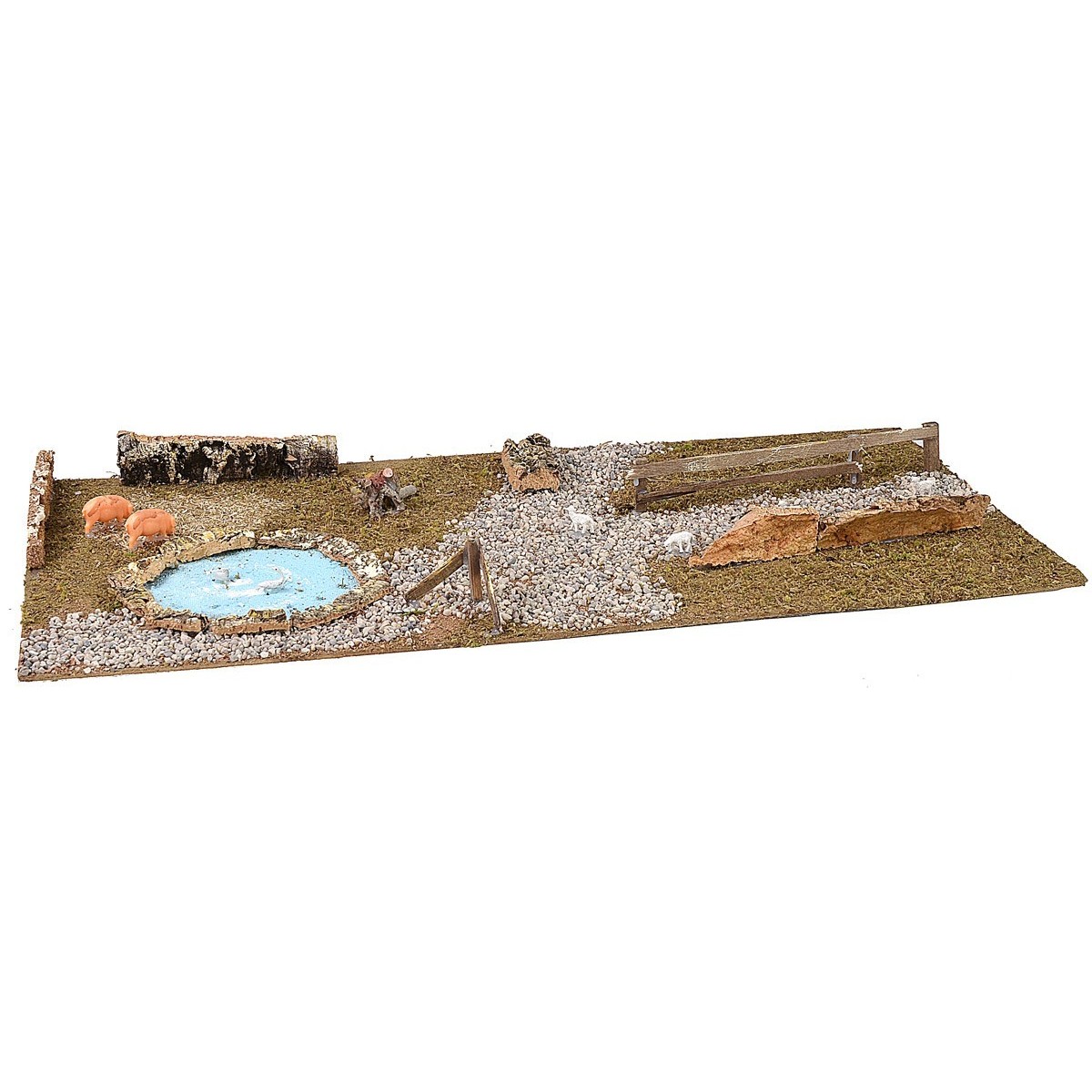 Perfect wooden base for the construction of your DIY nativity scene, decorated with moss and pebbles that create the path that leads to the pond. Several animals complete the setting, such as grazing sheep, swans in the pond and pigs; the whole is enriched by a fire and a fence. The item is recommended for statues of 10-12 cm height.