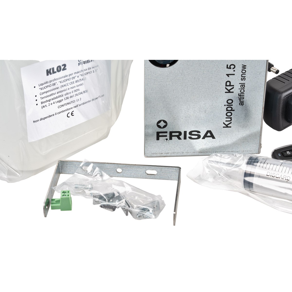 KP1.5 is a compact and lightweight snow effect machine, designed to emulate the snowfall quality of larger models with an improved management system. It can operate in both manual and automatic modes, manageable via START/STOP with 12 volt DC, via clean contact, with the provided remote control or with an intermittent switch.