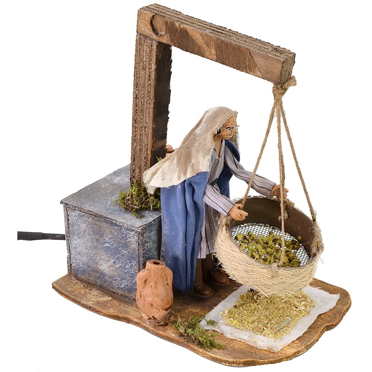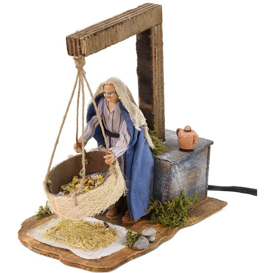 Cernatore in stile napoletano 12 cm in movimento, muove le braccia con cui impugna il cesto. La statua presenta un viso di terracotta molto espressivo ed è accuratamente vestita con abiti in tessuto, ogni pezzo è realizzato interamente a mano da artigiani italiani pertanto i colori e gli abiti potrebbero variare. L'articolo è funzionante a corrente.