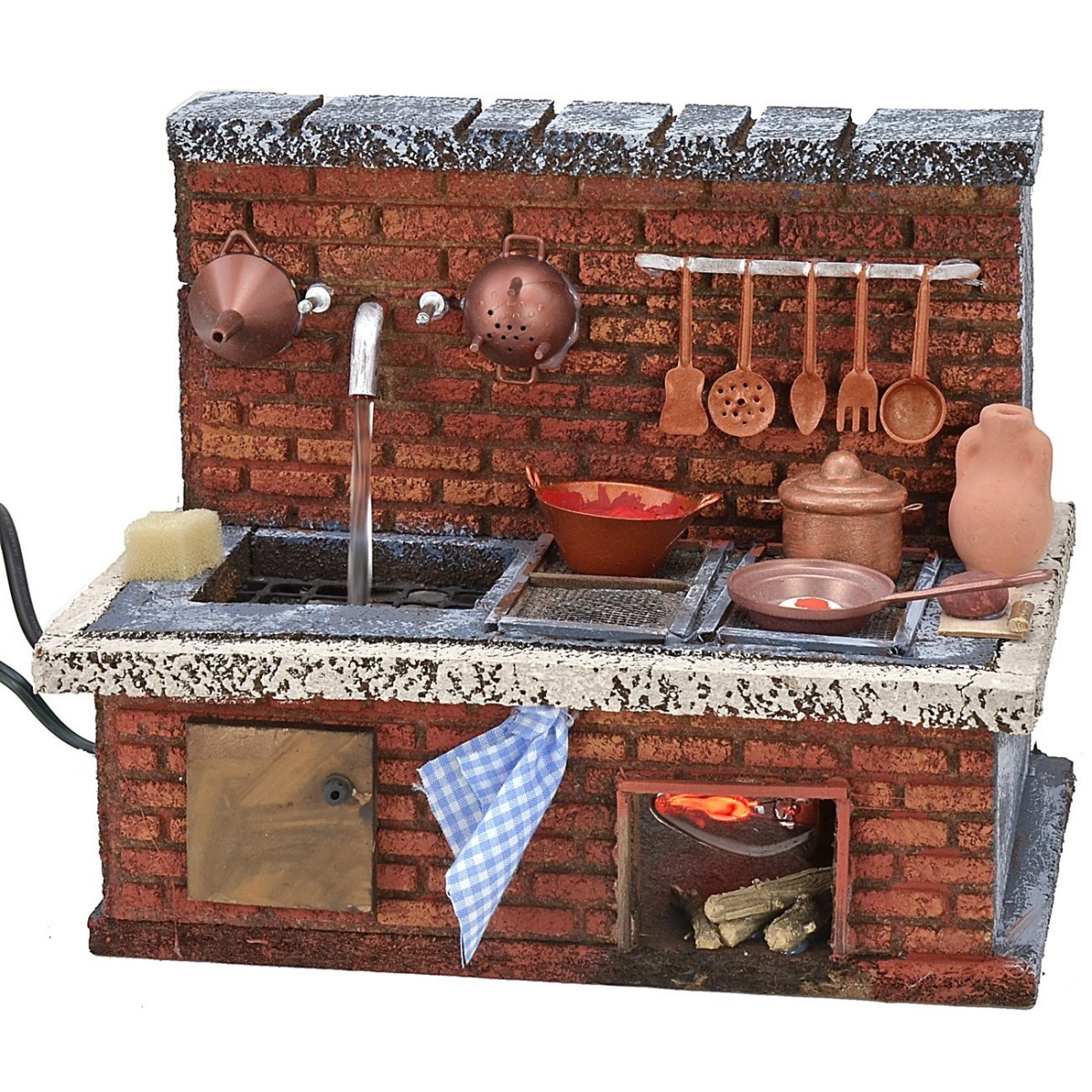 Rustic kitchen for crib, in the lower part there is a current-operated fire with light that reproduces the flame effect, on the shelf, note the sink from which water flows complete with a current-operated pump. The scene is enriched by the hob and various kitchen accessories. The setting was handcrafted in Italy with wood and cork, it is recommended for statues with a height of 12 to 15 cm and it should be noted that being produced by hand, it may vary slightly from the photo. In the FINISHING ACCESSORIES section there are many accessories for the crib to match.
