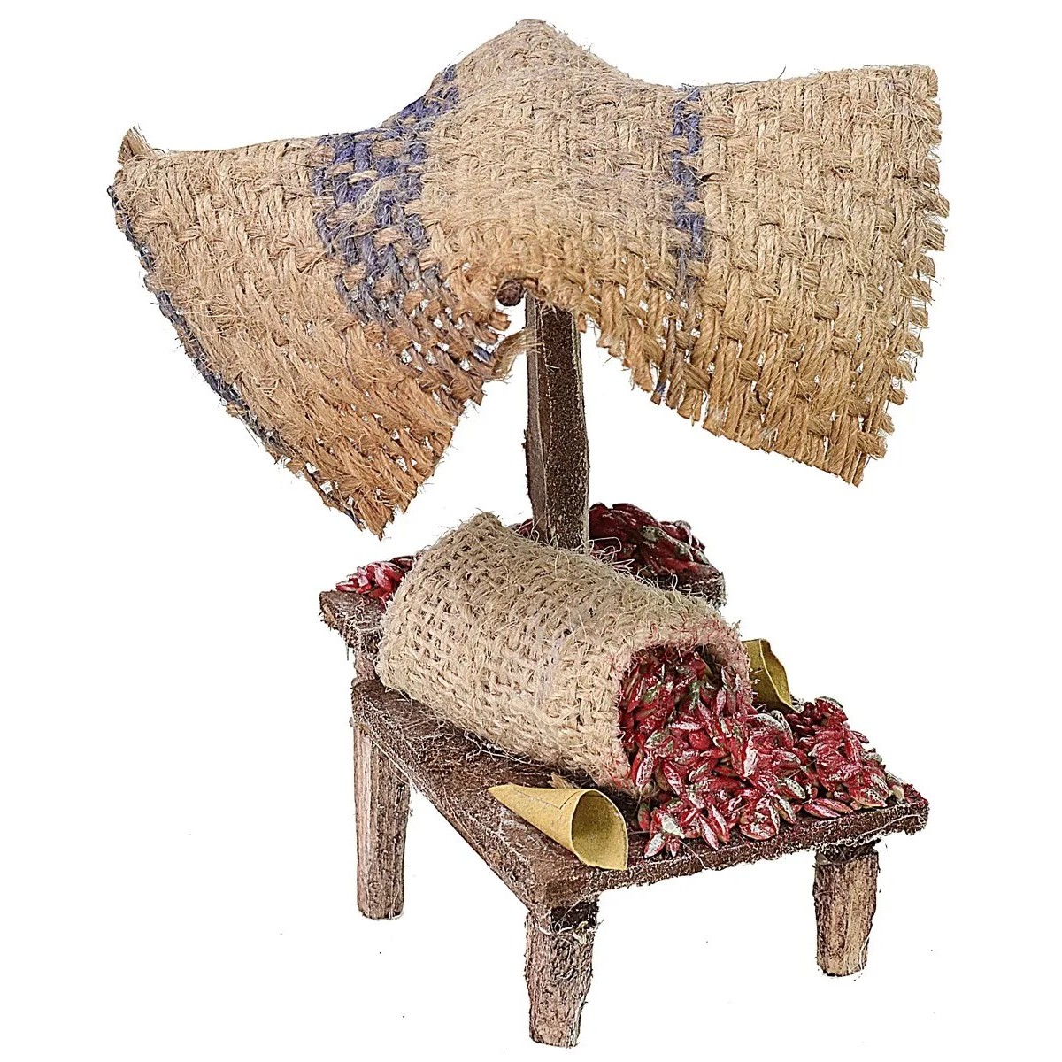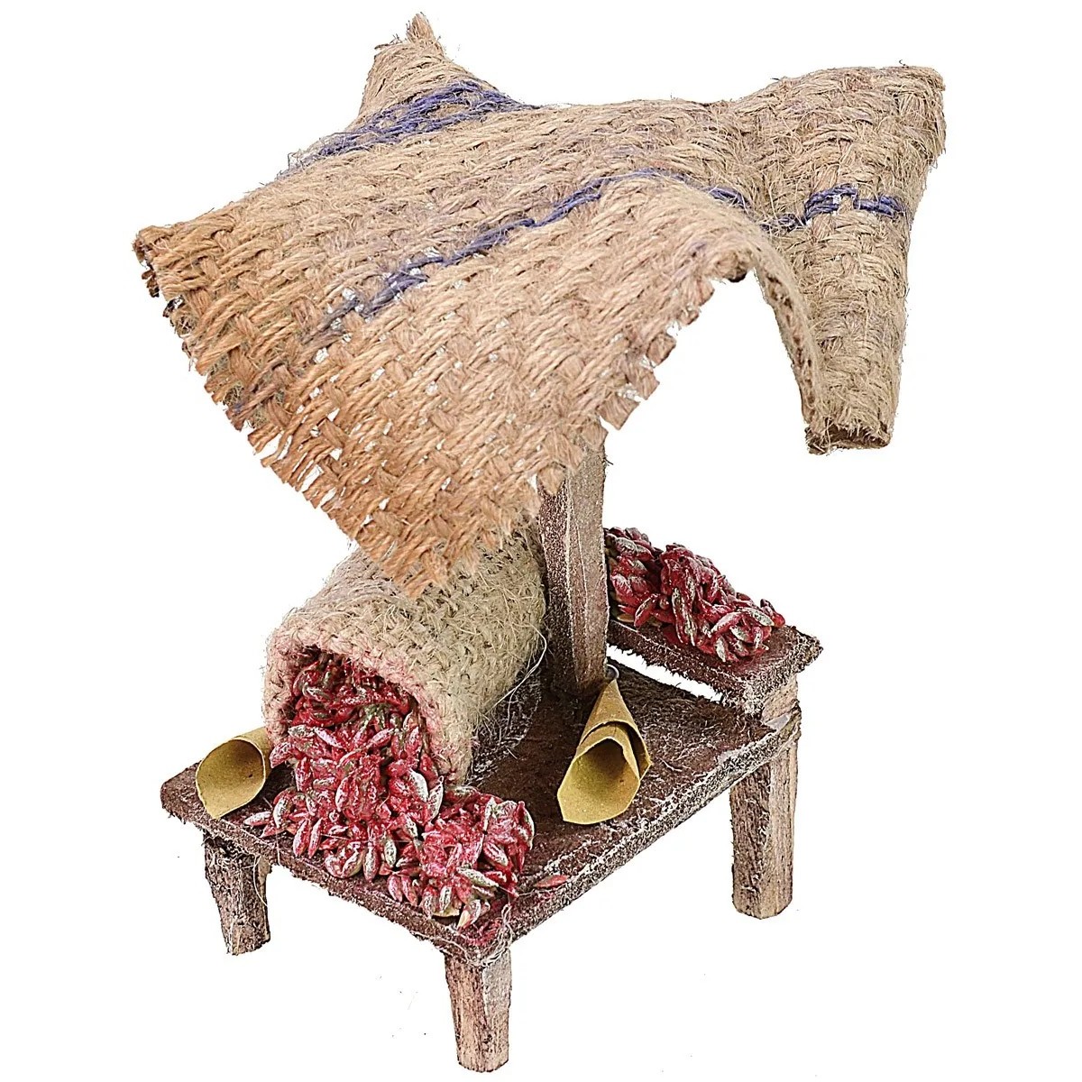 Stall with a sack full of chili peppers, handcrafted by skilled Italian hands, made of wood and terracotta. The product is well-finished in detail, recommended to add a touch of originality to your Nativity scene and suitable for statues of height 8-10 cm. It should be noted that being handmade, it may slightly vary from the photo.