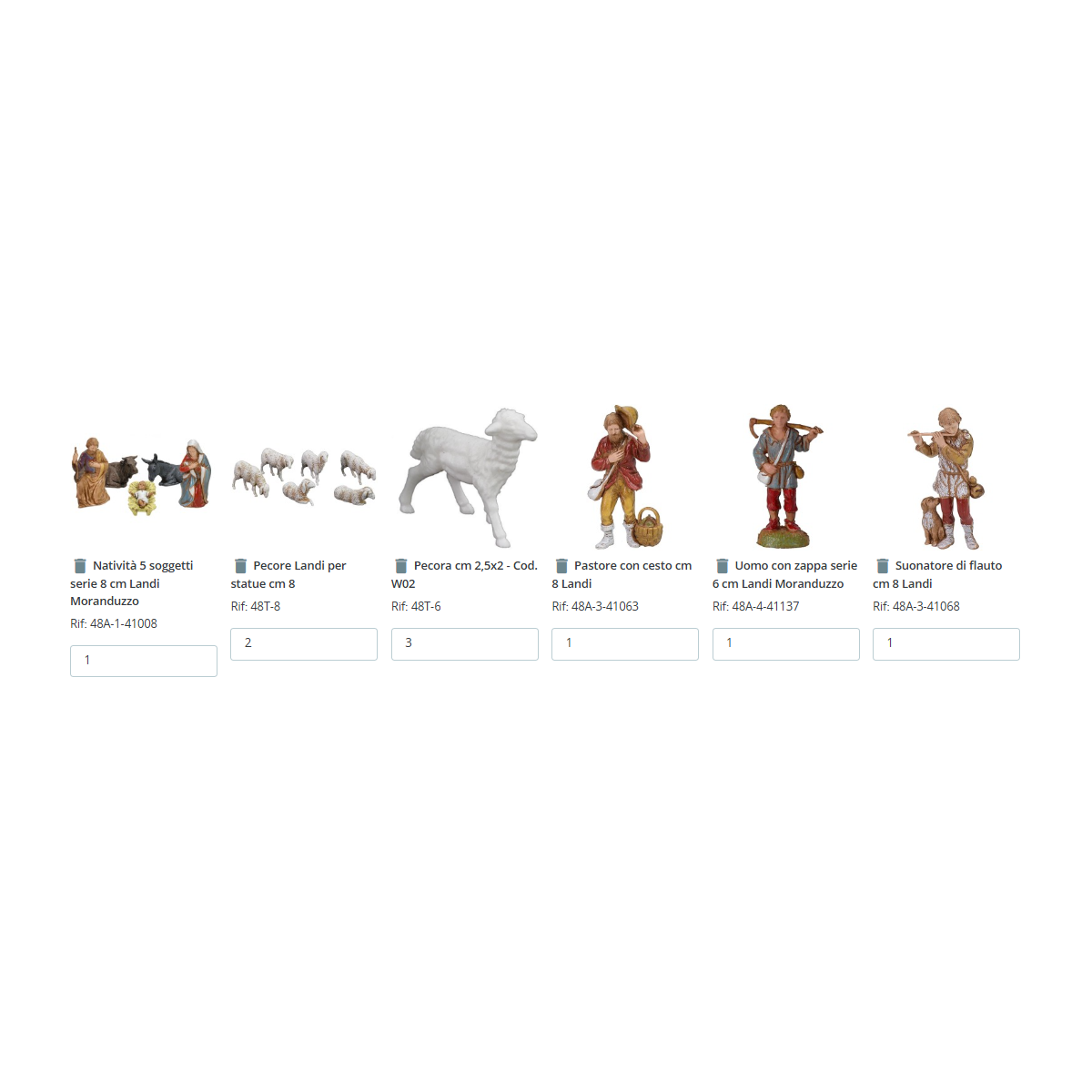 The nativity scene will be shipped with the same quantity of figurines shown in the photo; the subjects may vary according to availability.