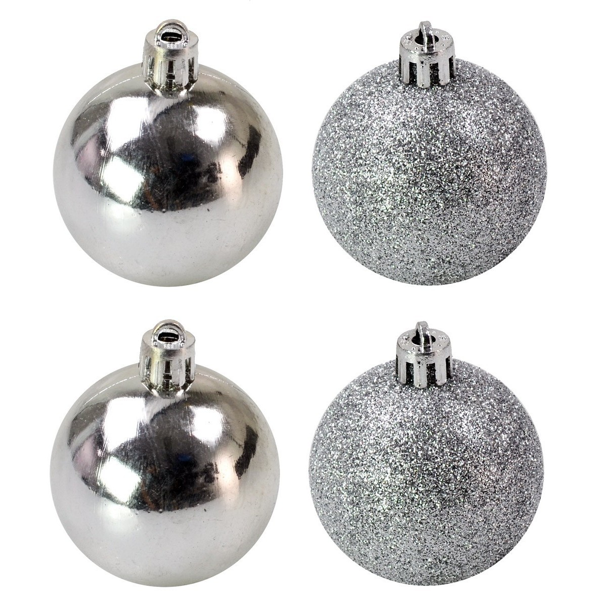 Set consisting of 4 balls diameter 5 cm for Christmas tree, 2 pieces are in glitter silver color and 2 pieces in metallic silver. In our online shop, balls of the same model are available in other sizes.