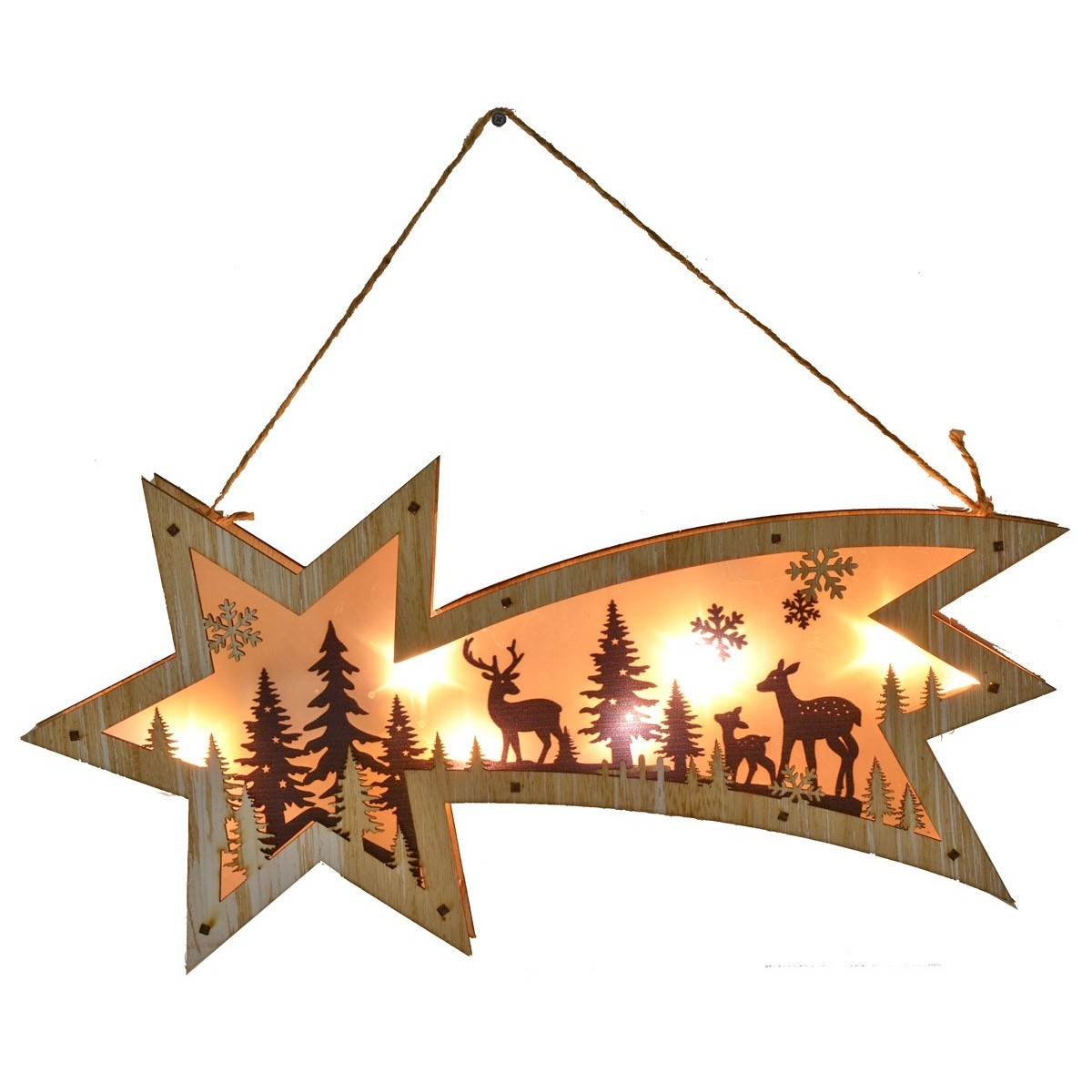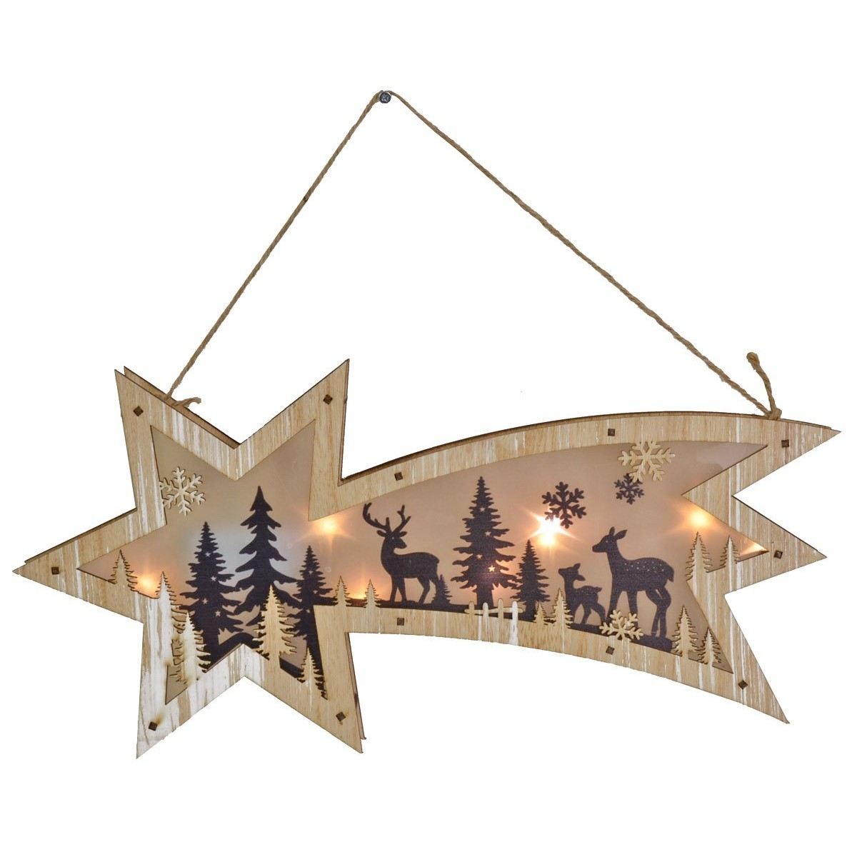 Illuminated comet running on 2xAAA batteries (not included). The scene depicted inside is a typical mountain environment with reindeer and deer in the woods.