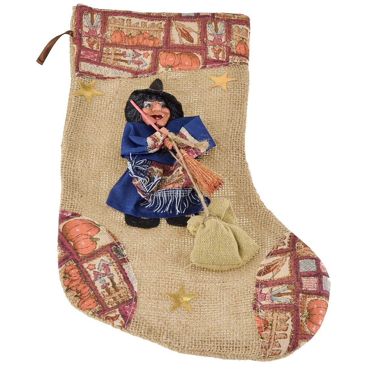 Calza Befana in juta, con raffigurazione di una befana in miniatura con occhi che s'illuminano e suona. La calza può essere riempita di dolci.