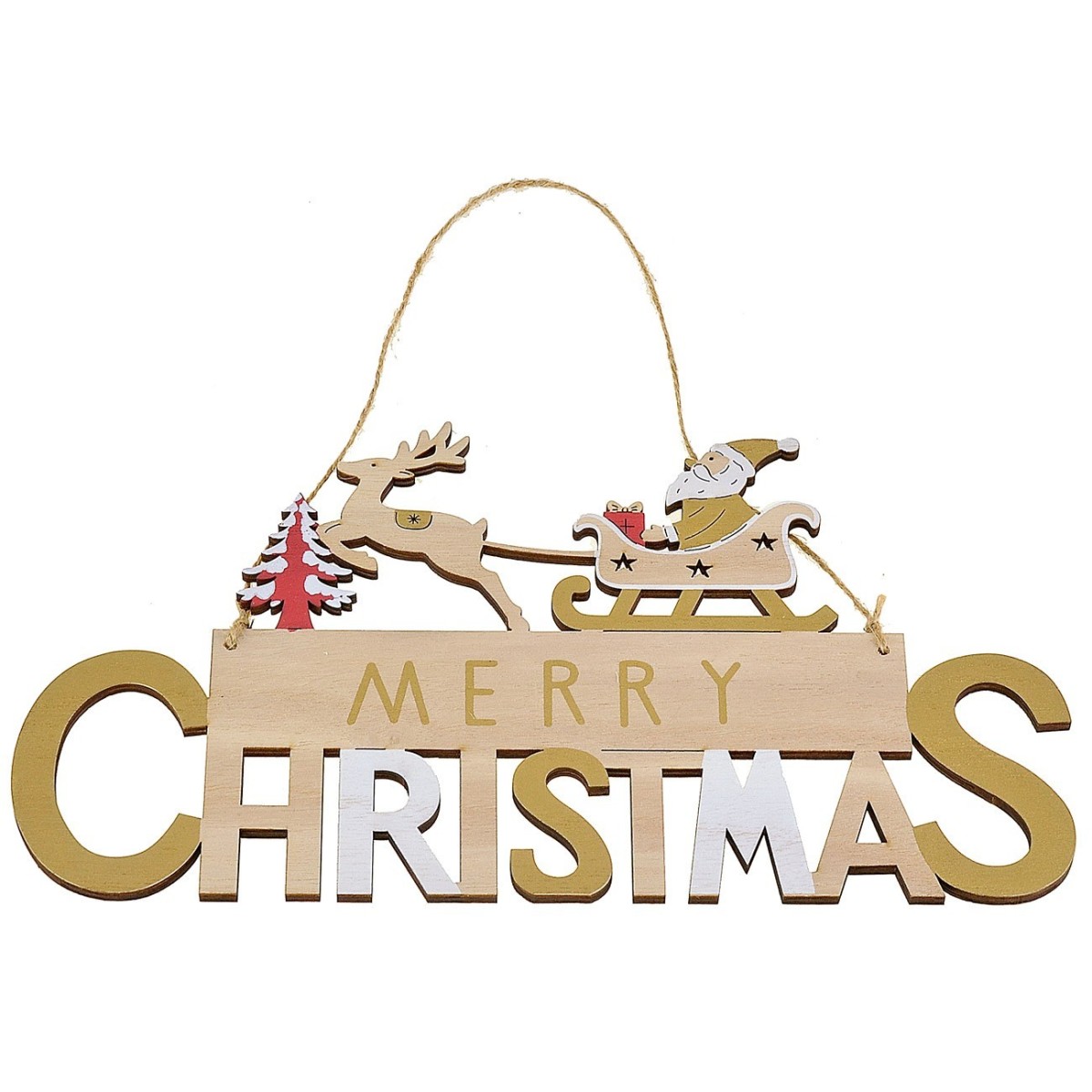 Appendino in legno con Babbo Natale sulla slitta trainata dalla renna e scritta '' Merry Christmas''. L'articolo è disponibile nelle colorazioni: argento, marrone, oro e rossa. Il colore si seleziona tramite il menu a tendita situato sopra il pulsante "aggiungi al carrello".