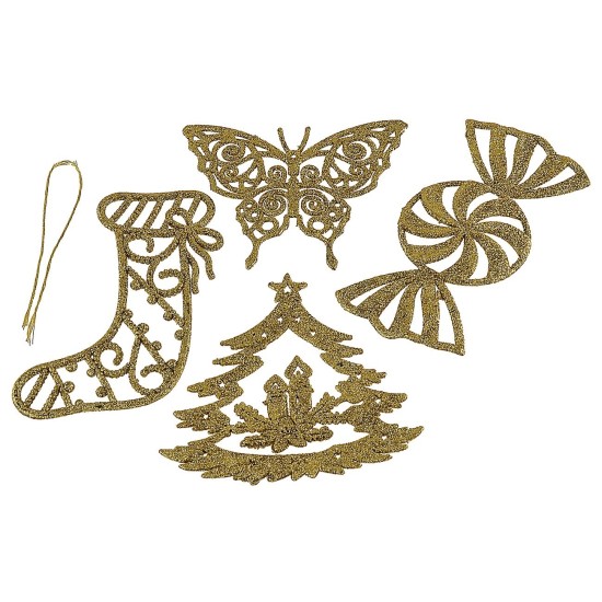 Decorazioni natalizie da appendere color oro glitterato in plastica e complete di lacci, il set si compone di quattro figure: stivale, farfalla, caramella e albero di natale. Gli articoli sono ideali per creare addobbi di Natale per case e alberi.