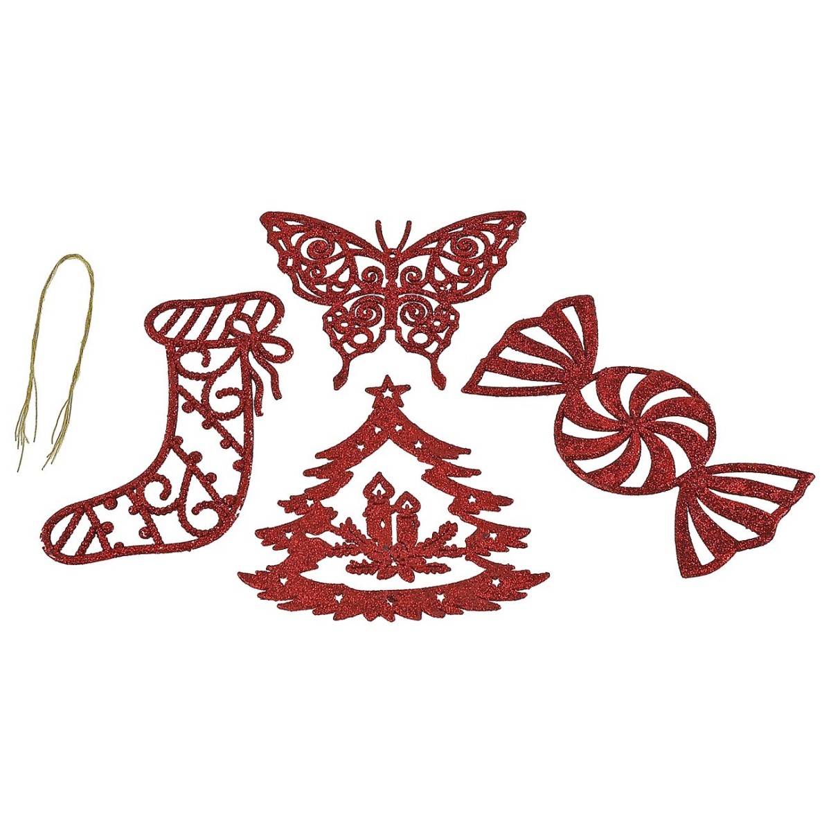 Decorazioni natalizie da appendere color rosso glitterato in plastica e complete di lacci, il set si compone di quattro figure: stivale, farfalla, caramella e albero di natale. Gli articoli sono ideali per creare addobbi di Natale per case e alberi.