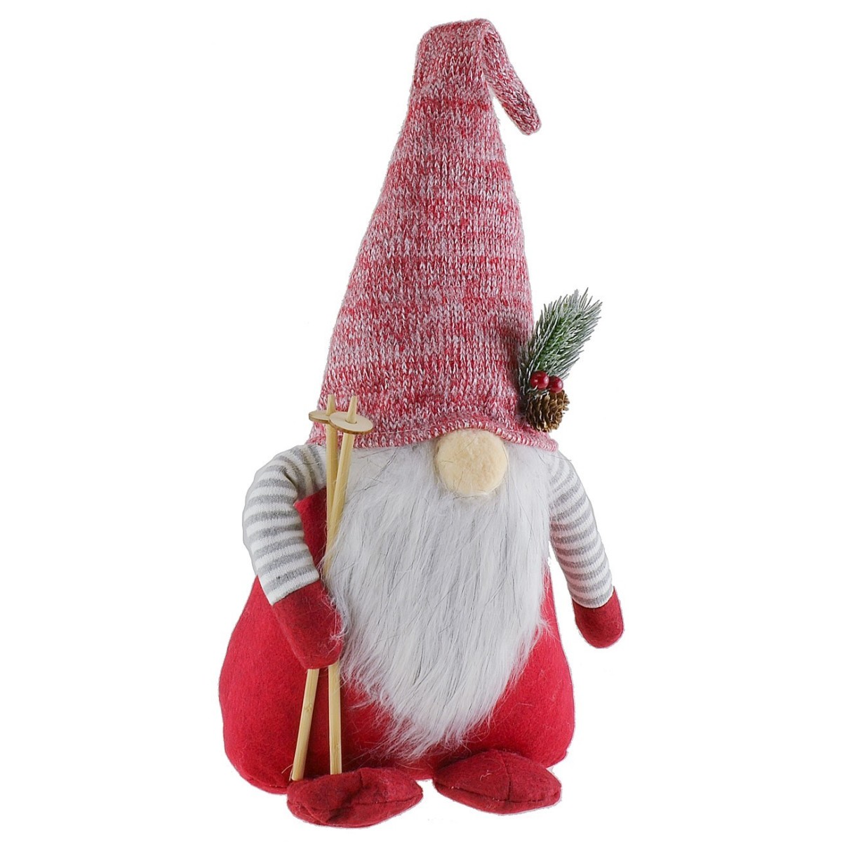 Christmas decoration depicting a dwarf with ski poles, a white-grey beard and a red and white hat with a moldable tip.