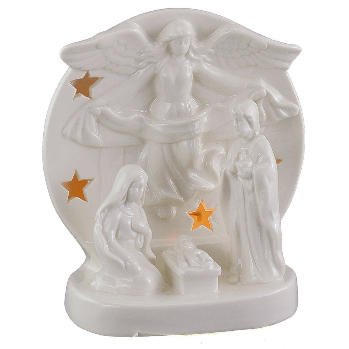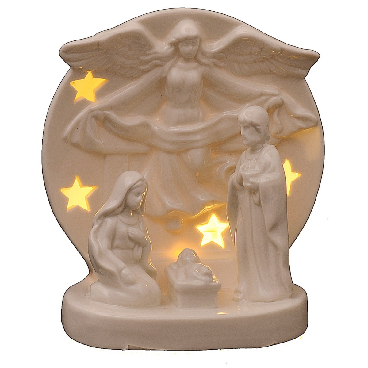 3D Nativity with ceramic angel and illuminated stars. The item runs on batteries (2xLR44 included) placed under the base and is operated with the switch to turn the light on and off.