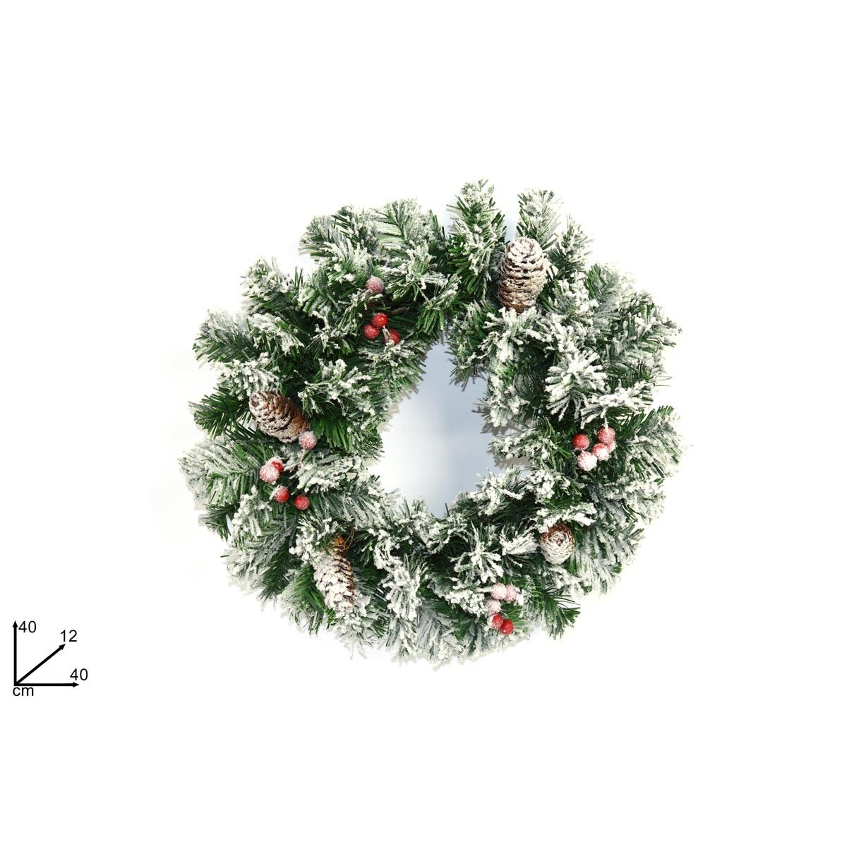Snowy door background decorated with berries and pine cones, the external diameter measures 40 cm. The item is ideal for creating a Christmas atmosphere in your homes.