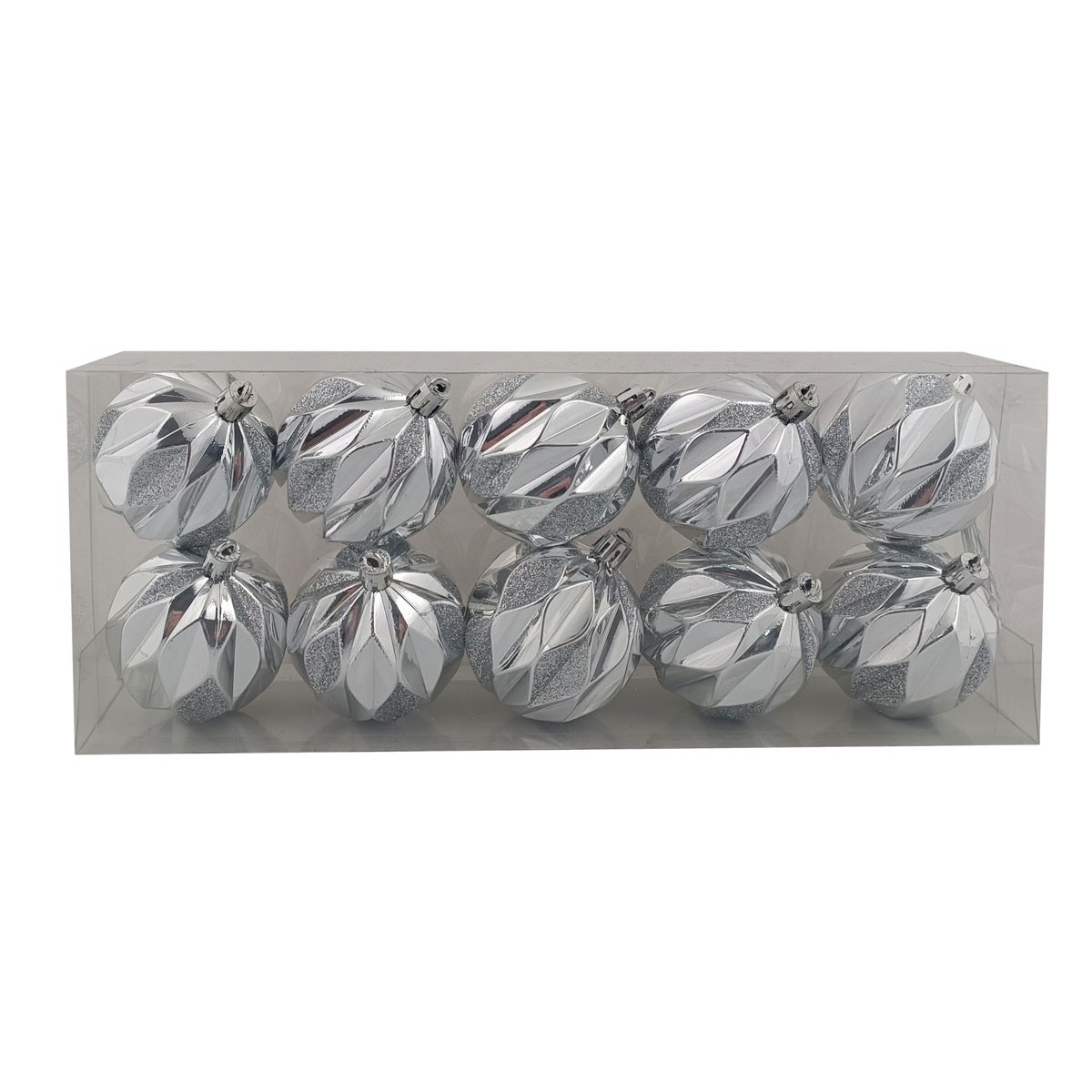 Set composed of 10 silver-colored spheres with rhombus decoration, with a diameter of 6 cm for Christmas tree.