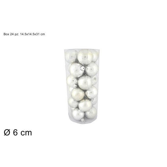 Set consisting of 24 silver-colored spheres with decorations, with a diameter of 6 cm for Christmas tree in PVC.