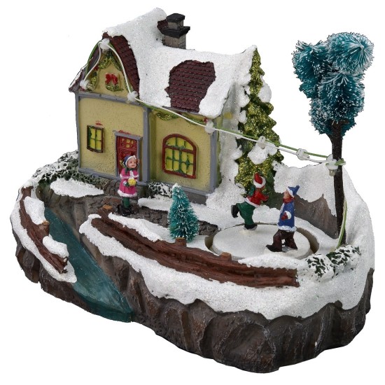 Scenografia natalizia cm 23x15x18,5 h raffigurante una casa e una pista di pattinaggio con 3 personaggi. L'articolo prevede due modalità di funzionamento: possono essere attivati solo il movimento e le luci, oppure è possibile attivare sia il movimento e le luci che la musica. Il prodotto è funzionante tramite batterie NON incluse nell'acquisto ed è stato realizzato in plastica e resina.