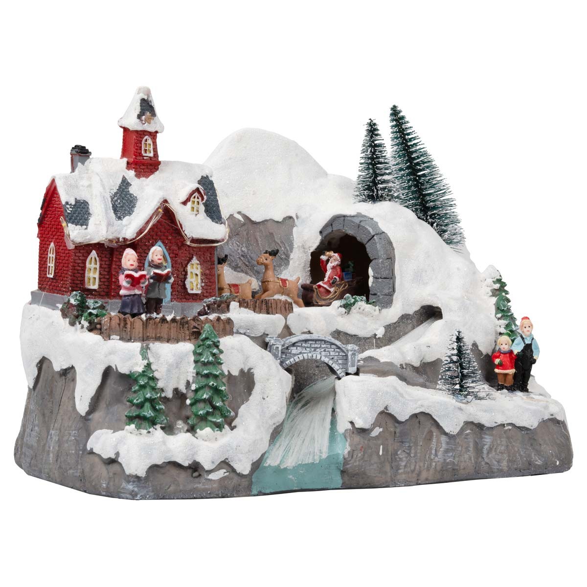 This Christmas carousel features a sleigh with Santa Claus pulled by reindeer, following a path within the village. The landscape is completed by a stream represented by luminous wires, with a gray bridge crossing it. Additionally, there are snow-covered pines and a red house decorated with festive elements, along with various small figurines. The snow blanket, glittering and illuminated by integrated lights, creates a suggestive effect. The carousel includes a musical function that offers a selection of Christmas songs.