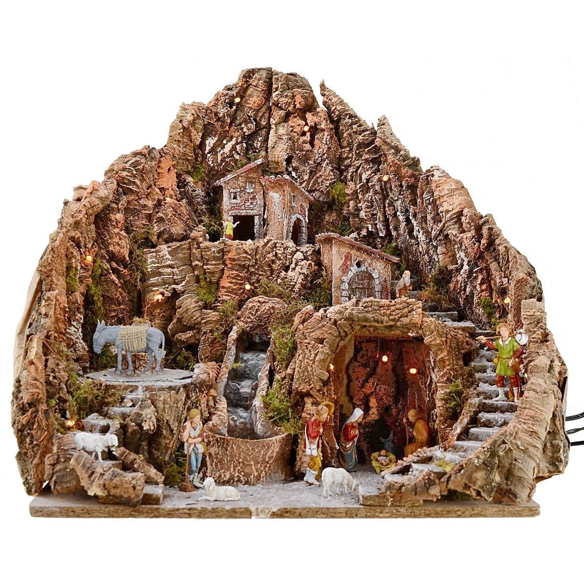 Presepe illuminated complete with statues Landi Moranduzzo series cm 6-8, with complete cascade of pump and donkey with rotating ground running.