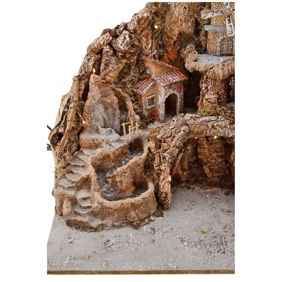Handcrafted illuminated nativity scene, with a fountain from which water flows down in a complete cascade with a pump, a windmill with rotating blades, and lights powered by electricity. It is possible to complete the Nativity scene with Landi Moranduzzo statues from 6 to 10 cm, according to your tastes and preferences, playing with perspective: in particular, it is ideal to place 10 cm series statues in the foreground and in the cave, 8 cm figures on the slope, and 6 cm characters at the top. We also remind you that the Landi Moranduzzo 10 cm series has an actual height of about 8.5-9 cm, while the 8 cm series has an actual height of about 7 cm. The product is entirely made by skilled artisan hands.