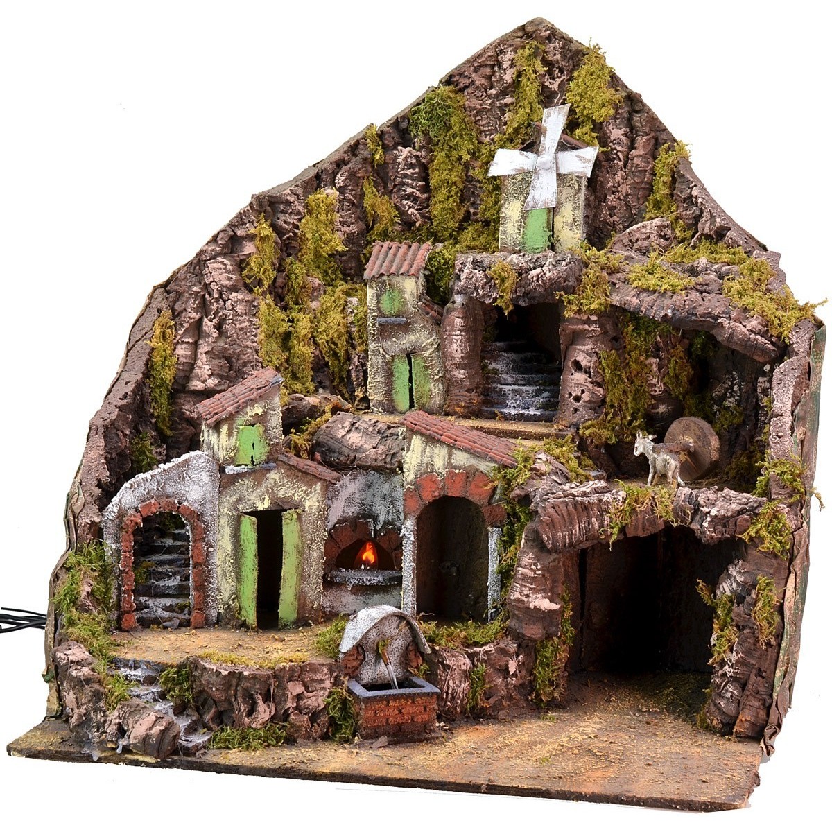 Illuminated nativity scene with functioning fountain, fire and mill cm 60x45x60 h