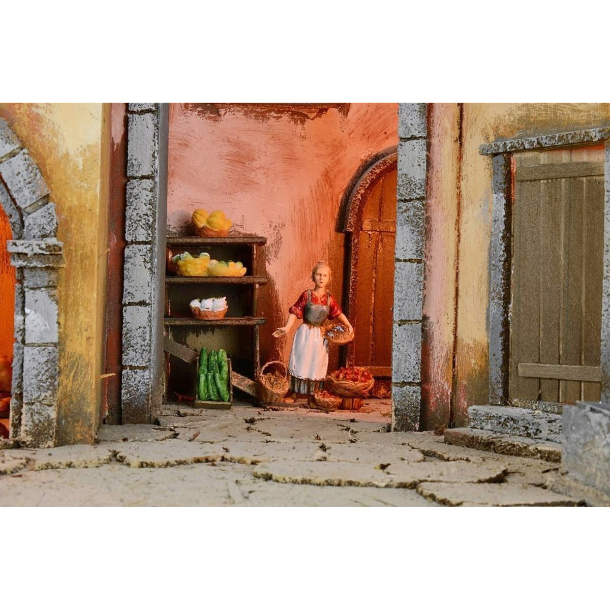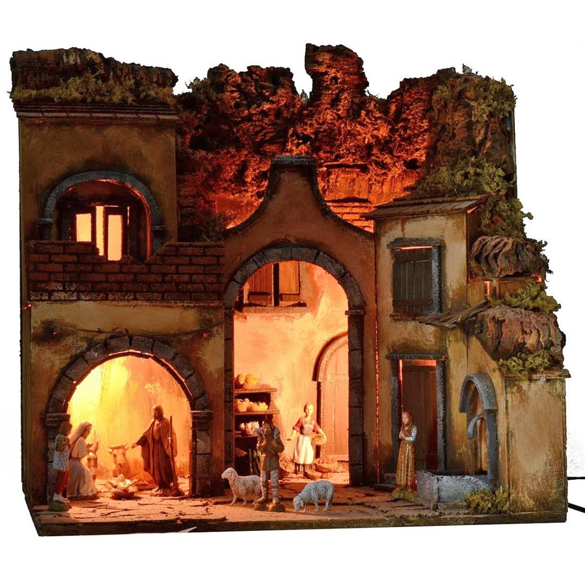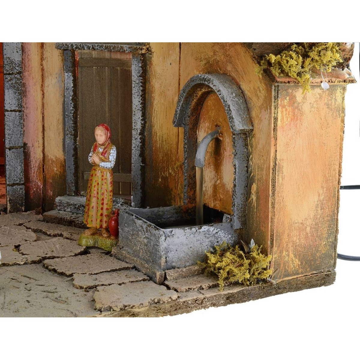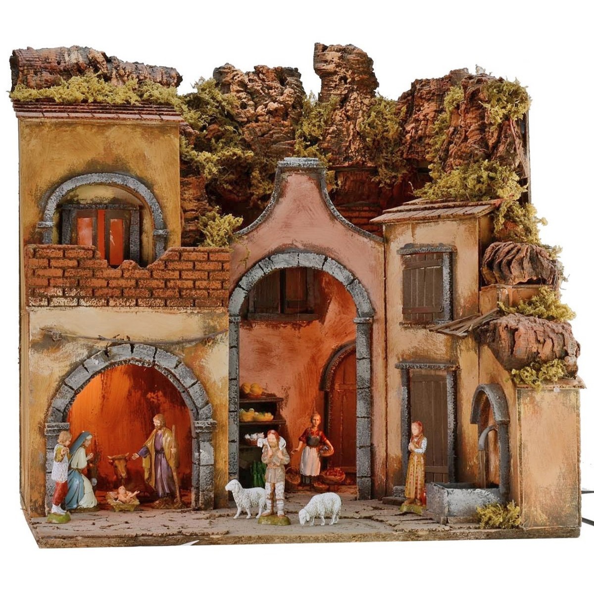 Illuminated artisan nativity scene in the classic-Neapolitan style, complete with Landi Moranduzzo statues and characterized by a fountain running on electricity, complete with a continuous water recycling pump. The scenography is well finished in detail: on the lower floor there is a large space delimited by an arched entrance, inside which there are statues of the Nativity Landi Moranduzzo 10 h cm high. Furthermore, still on the lower floor, near the fountain, there is a wooden entrance door to a house and an imposing arch that allows entry into a courtyard. Here, it is possible to identify an exhibition furniture, ideal to set up to create a stall. In the whole lower area it is possible to place statues of the same size as desired. Upstairs there is a balcony instead. The current-operated lights that illuminate the landscape give a suggestive atmosphere. Furthermore, the use of moss and bark makes the landscape very realistic, as it is dense with green vegetation and surrounding rocky walls. Product made entirely by skilled artisan hands. Item entirely made in Italy by skilled artisan hands, using cork, wood and moss. We remind you that the 10 cm Landi Moranduzzo series has a real height of about 9 cm. It should also be noted that the number of the figurines will always remain the same as the photo, but the subjects could be replaced with others from the Landi Moranduzzo series according to the availability.