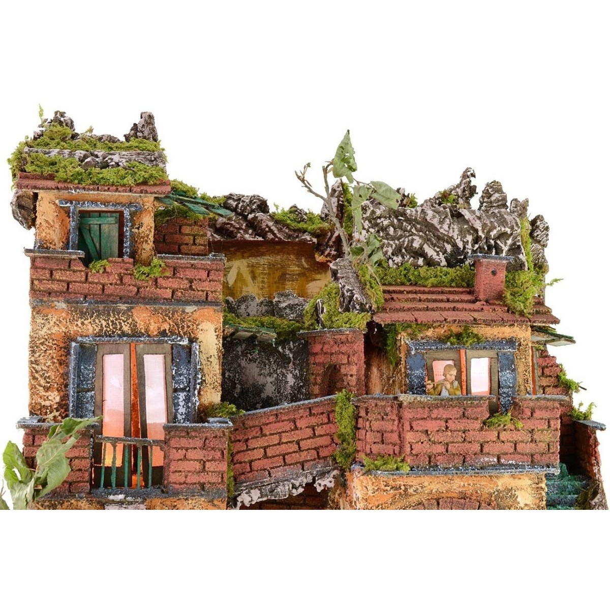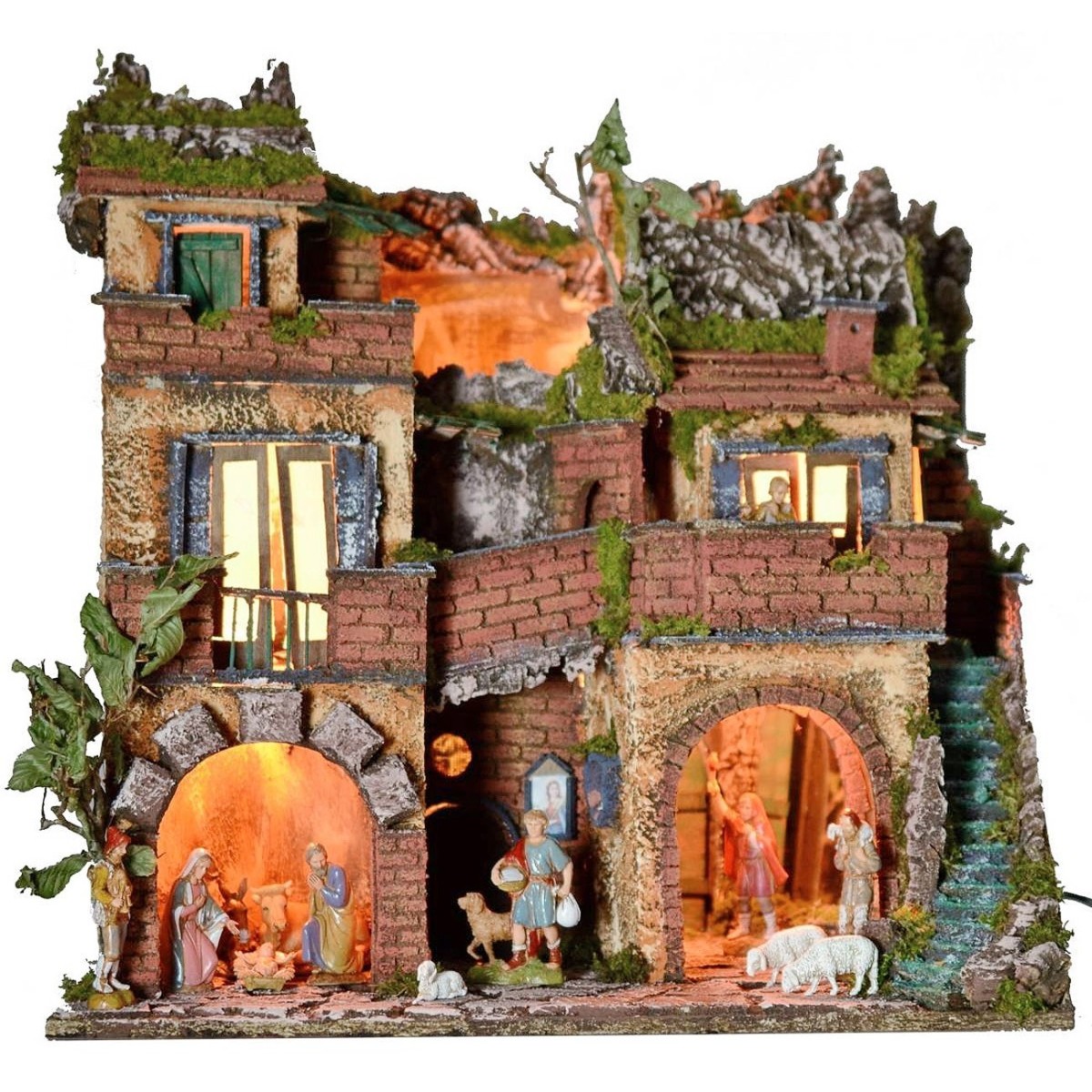 Illuminated artisan nativity scene complete with Landi Moranduzzo statues in a classic-Neapolitan style, characterized by a mirror that gives an important depth effect. The scenography is well finished in detail: on the lower floor there is a space delimited by an arch inside which there are statues of Nativity 10 h cm high. Furthermore, also on the lower floor, there is a central entrance door with an icon hanging on the wall and an arched entrance to the courtyard, of which it is possible to see the interior thanks to a mirror that also gives an important depth effect. Inside it is possible to see a well, trees and a balcony. In the whole lower area it is possible to place statues of 10 h cm recommended height. Along a staircase that leads up to the upper floor, we find two well-finished houses with balconies; while on the top floor an additional balcony completes the Nativity scene. The current-operated lights that illuminate the landscape give a suggestive atmosphere. Furthermore, the use of moss and bark makes the landscape very realistic, as it is dense with green vegetation and surrounding rocky walls. Product made entirely by skilled artisan hands. Item entirely made in Italy by skilled artisan hands, using cork, wood and moss. We remind you that the 10 cm Landi Moranduzzo series has a real height of about 9 cm. It should also be noted that the number of the figurines will always remain the same as the photo, but the subjects could be replaced with others from the Landi Moranduzzo series according to the availability.