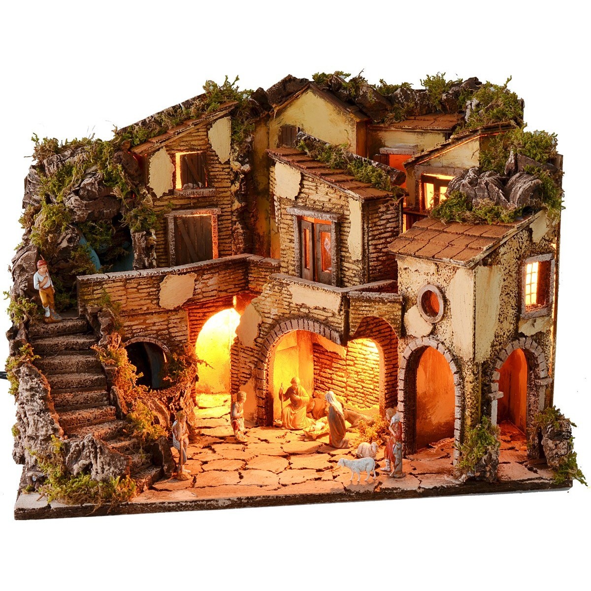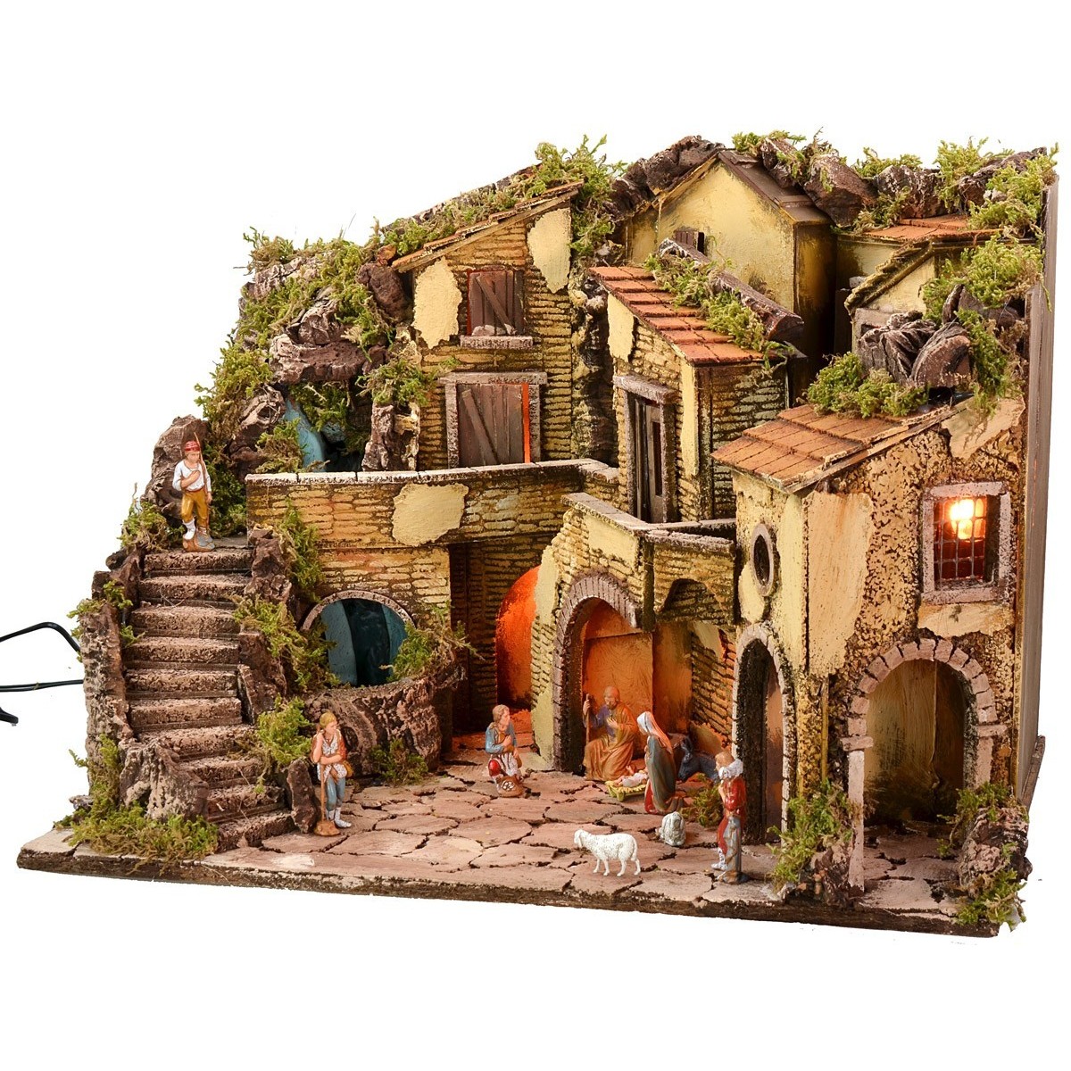 Presepe artigianale illuminato dallo stile classico-napoletano, completo di statue Landi Moranduzzo e caratterizzato da una cascata funzionante, completa di pompa a riciclo d'acqua continuo. La scenografia si presenta ben rifinita nei dettagli: al piano inferiore è presente uno spazio delimitato da una porzione di arco all'interno del quale sono collocate statue di Natività di altezza 10 h cm. Inoltre, sempre al piano inferiore, è presente uno spazio da poter sfruttare a proprio piacimento (creare una bottega, deposito attrezzi etc...). In tutta la zona inferiore è possibile collocare statue a proprio piacimento di altezza consigliata 10 h cm. Percorrendo una scalinata che conduce fino al piano superiore, dove la cascata si sviluppa, troviamo molteplici abitazioni ben rifinite con porte d'ingresso e balconi. Regalano un'atmosfera suggestiva le luci, funzionanti a corrente, che illuminano il paesaggio. Inoltre, l'utilizzo del muschio e della corteccia rende il paesaggio molto realistico, in quanto fitto di verde vegetazione e pareti rocciose circostanti. Prodotto realizzato interamente da sapienti mani artigiane. Articolo realizzato interamente in Italia da sapienti mani artigiane, utilizzando il sughero, il legno ed il muschio. Ricordiamo che la serie Landi Moranduzzo da cm 10 ha un'altezza reale di circa cm 9. Si precisa, inoltre, che il numero delle statuine rimarrà sempre uguale alla foto, ma i soggetti potrebbero essere sostituiti con altri della serie Landi Moranduzzo in base alle disponibilità.