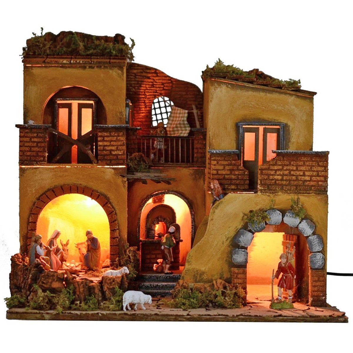 Illuminated handcrafted nativity scene, in a classic-Neapolitan style, complete with Landi Moranduzzo statues and characterized by an oven and fire-effect wood running on electricity. The scenography is well finished in detail: on the lower floor there is a space outlined by an arched entrance inside which statues of Nativity Landi are placed 10 h cm high. In addition, always on the lower floor, there is a functioning oven with a fire effect, thanks to the flickering light that is very impactful and realistic, and a space, with an open double-leaf wooden entrance door, to be exploited to your liking (create a shop, tool shed etc ...). In the whole lower area it is possible to place statues of 10 h cm recommended height. Thanks to a staircase that leads from the lower floor to the upper one, it is possible to reach a house. Upstairs, however, we find many well-finished houses with entrance doors, balconies and a drying room. The current-operated lights that illuminate the village give a suggestive atmosphere. Furthermore, the use of moss and bark makes the landscape very realistic, as it is dense with green vegetation and surrounding rocky walls. Product made entirely by skilled artisan hands. Item entirely made in Italy by skilled artisan hands, using cork, wood and moss. We remind you that the 10 cm Landi Moranduzzo series has a real height of about 9 cm. It should also be noted that the number of the figurines will always remain the same as the photo, but the subjects could be replaced with others from the Landi Moranduzzo series according to the availability.