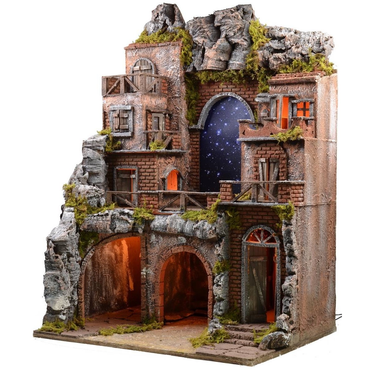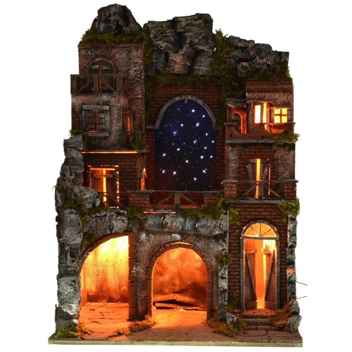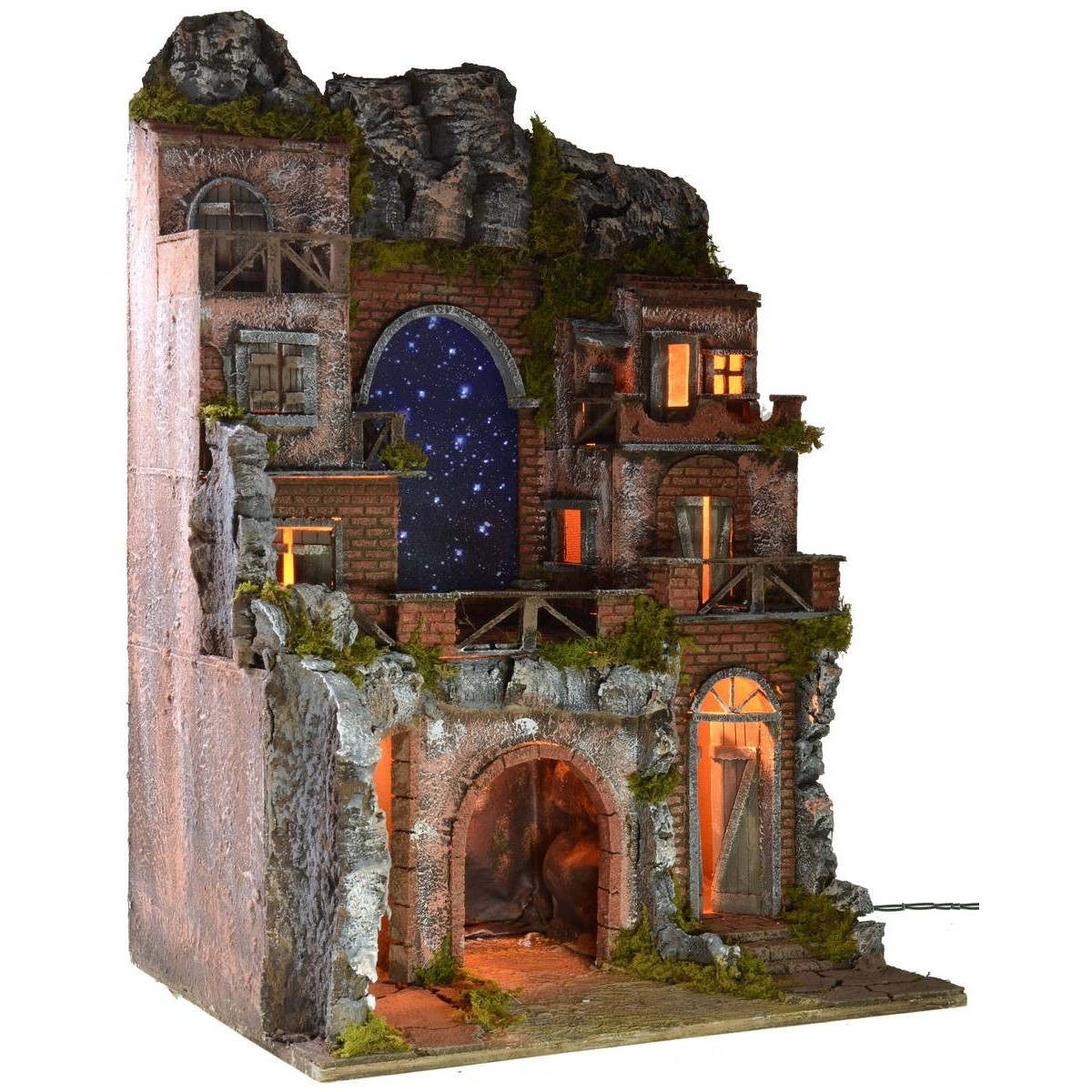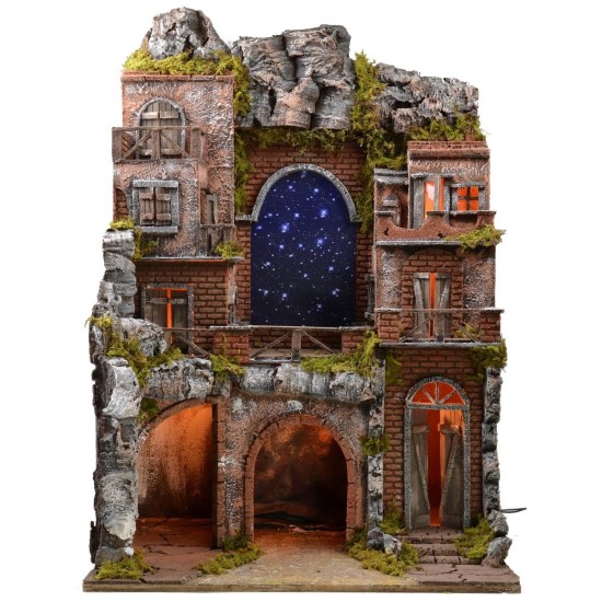Handcrafted nativity scene in a classic-Neapolitan style illuminated by warm lights running on current and by a panel with a starry sky with optical fibers, with a flickering effect, running on battery (2 AA batteries not included). The scenography is well finished in detail and develops in height: on the lower floor, we find two large caves where it will be possible to place Nativity statues with a recommended height of 12 cm; and we also find a semi-open wooden double-leaf entrance door, from which it is possible to access the upper floor. Here, there are houses with a common courtyard, where it will be possible to place statues with a recommended height of 10 cm. According to your tastes and needs, it will be possible to accentuate the perspective by also using 8 cm statues. The lights, running on electricity and the panel with a starry sky with fiber optics, running on batteries, give a suggestive atmosphere. Furthermore, the use of moss and bark makes the landscape very realistic, as it is dense with green vegetation and surrounding rocky walls. Item entirely made in Italy by skilled artisan hands, using cork, wood and moss. In related products it is possible to view some statues of Nativity 12 cm high.