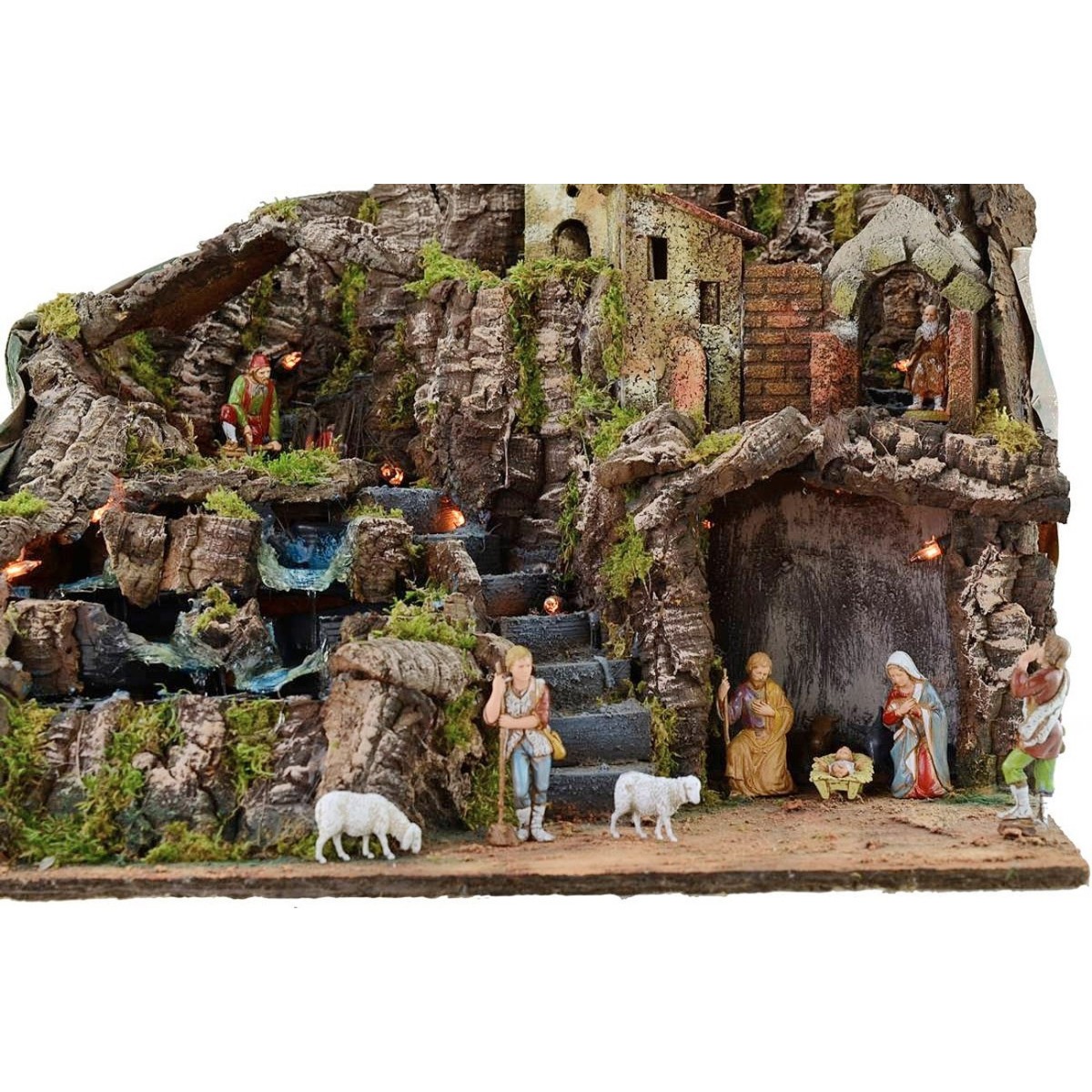 Illuminated artisan nativity scene in the classic-Neapolitan style, complete with Landi Moranduzzo statues and characterized by a functioning waterfall with double outlet complete with continuous water recycling pump and a current-working fire. The scenography is well finished in detail: on the lower floor there is a cave inside which statues of the Nativity Landi Moranduzzo are placed, 8 h cm high. Furthermore, always on the lower floor, there is a majestic waterfall with double water outlet and a staircase that leads to the upper floor. Here there is also a working fire with flickering light as well as a further staircase leading to a house at the top. The current-operated lights that illuminate the landscape give a suggestive atmosphere. Furthermore, the use of moss and bark makes the landscape very realistic, as it is dense with green vegetation and surrounding rocky walls. Item entirely made in Italy by skilled artisan hands, using cork, wood and moss. We remind you that the 8 cm Landi Moranduzzo series has a real height of about 7 cm. It should also be noted that the number of the figurines will always remain the same as the photo, but the subjects could be replaced with others from the Landi Moranduzzo series according to the availability.