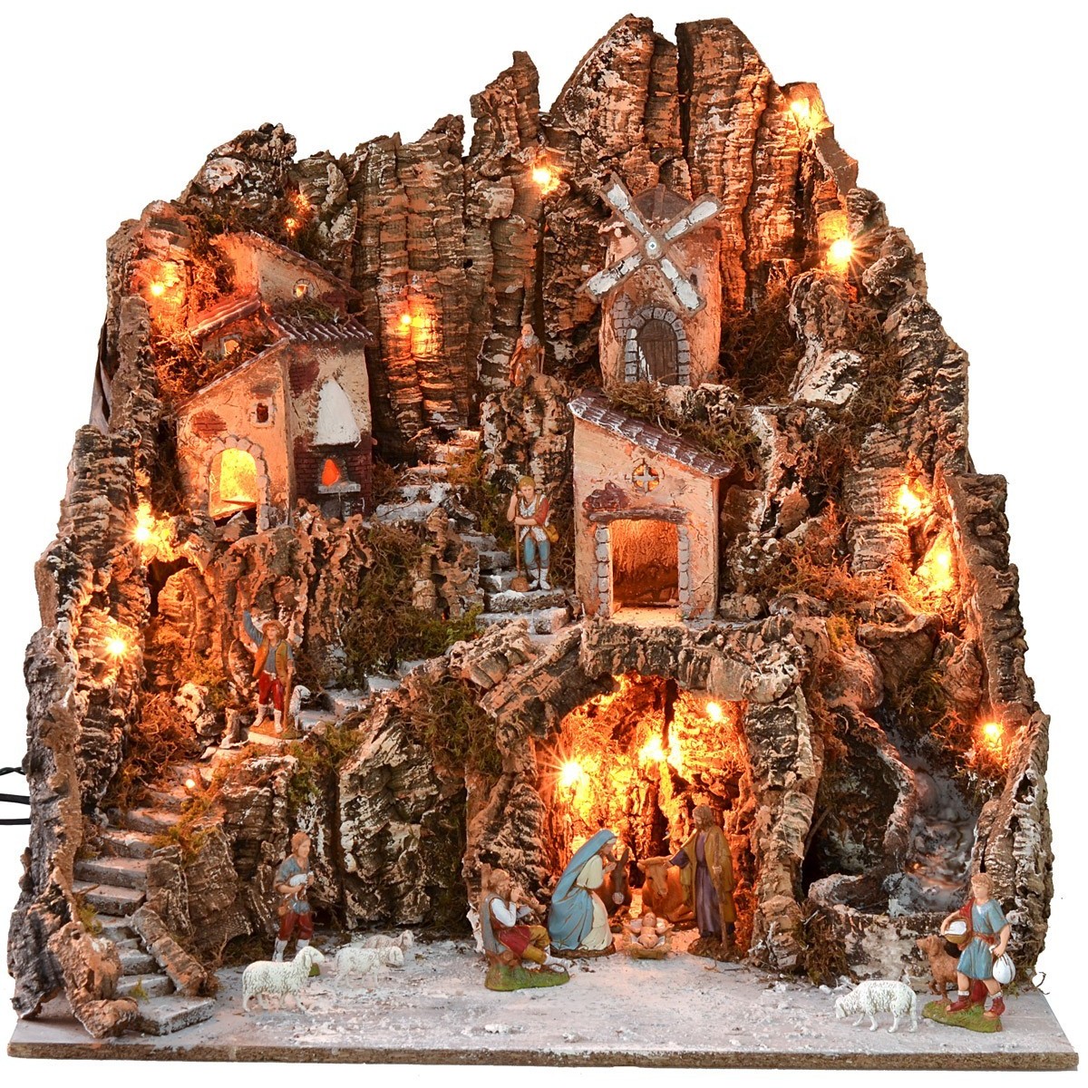 Illuminated nativity scene complete with Landi statues with windmill, waterfall and working oven cm 60x50x65 h