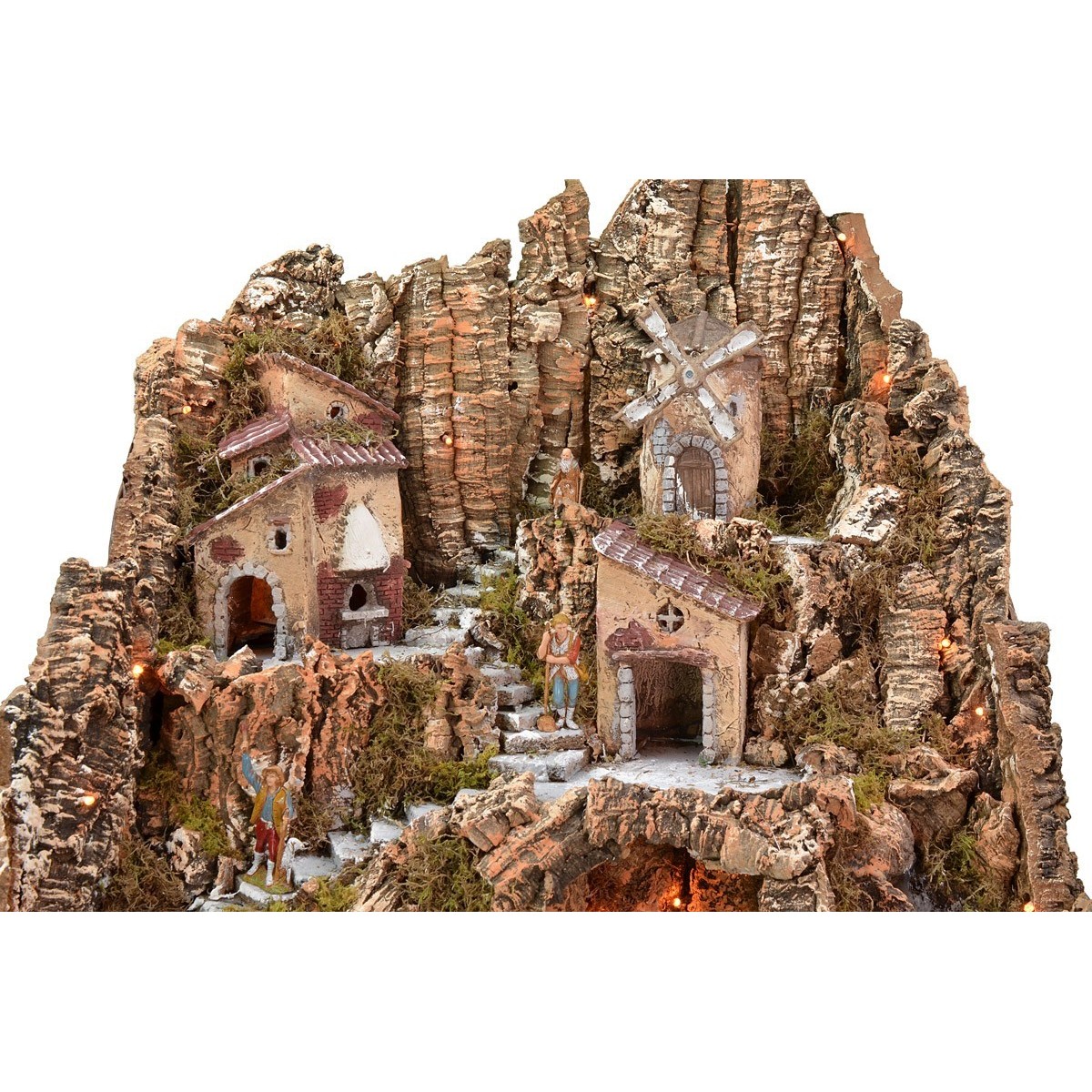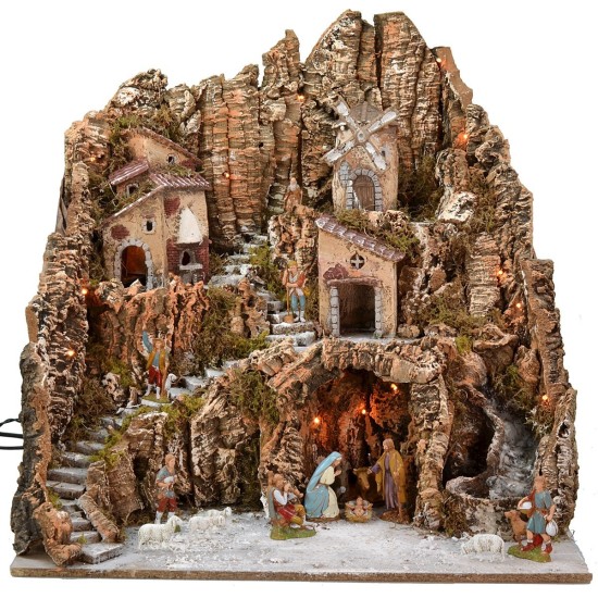 Presepe artigianale illuminato dallo stile classico-napoletano, completo di statue Landi Moranduzzo e caratterizzato da una cascata funzionante a corrente, completa di pompa a riciclo d'acqua continuo, mulino a vento con pale rotanti funzionanti a corrente e forno effetto fuoco funzionante a corrente. La scenografia si sviluppa in altezza e in un ambiente roccioso (possiamo individuare circa quattro piani) e si presenta ben rifinita nei dettagli: al piano inferiore, al centro della scenografia, troviamo una grotta dove sono collocate statue di Natività Landi Moranduzzo di altezza 10 h cm. Sulla destra, è invece presente la vasca della cascata che nasce nel secondo piano, mentre sulla sinistra troviamo una lunga scalinata verso il secondo piano. Qui è presente un'abitazione ed ulteriori scale per raggiungere il terzo piano, dove vi è una bottega con forno funzionante effetto fuoco. Nelle prossimità della bottega vi sono le ultime scale per raggiungere il quarto piano, dove troviamo il mulino a vento con pale rotanti funzionanti. Regalano un'atmosfera suggestiva le luci, funzionanti a corrente, che illuminano il borgo. Inoltre, l'utilizzo del muschio e della corteccia rende il paesaggio molto realistico, in quanto fitto di verde vegetazione e pareti rocciose circostanti. Articolo realizzato interamente in Italia da sapienti mani artigiane, utilizzando la resina, il sughero, il legno ed il muschio. Ricordiamo che la serie Landi Moranduzzo da cm 10 ha un'altezza reale di circa cm 9. Si precisa, inoltre, che il numero delle statuine rimarrà sempre uguale alla foto, ma i soggetti potrebbero essere sostituiti con altri della serie Landi Moranduzzo in base alle disponibilità.