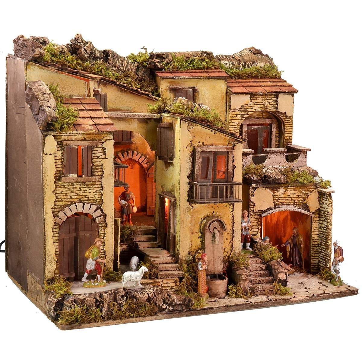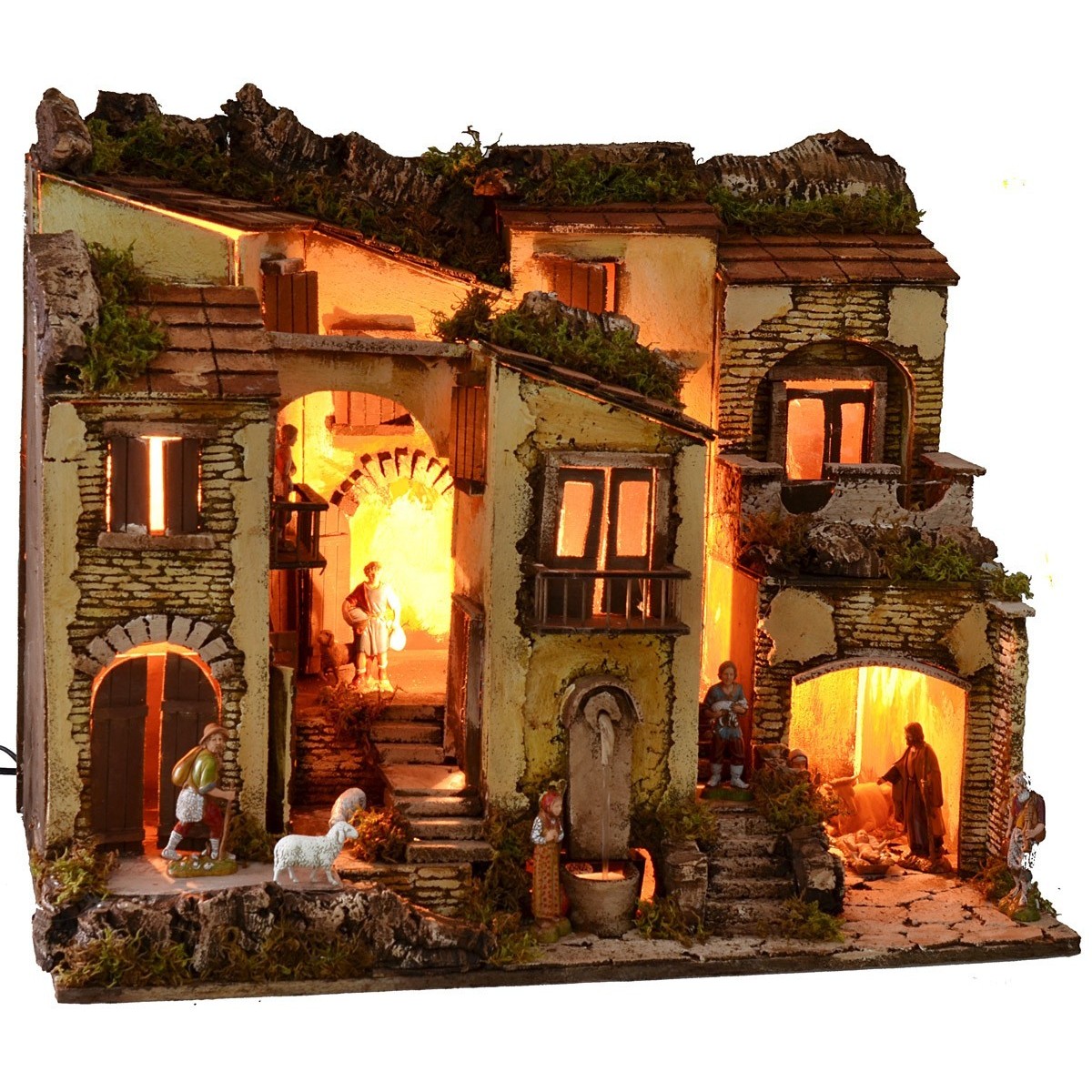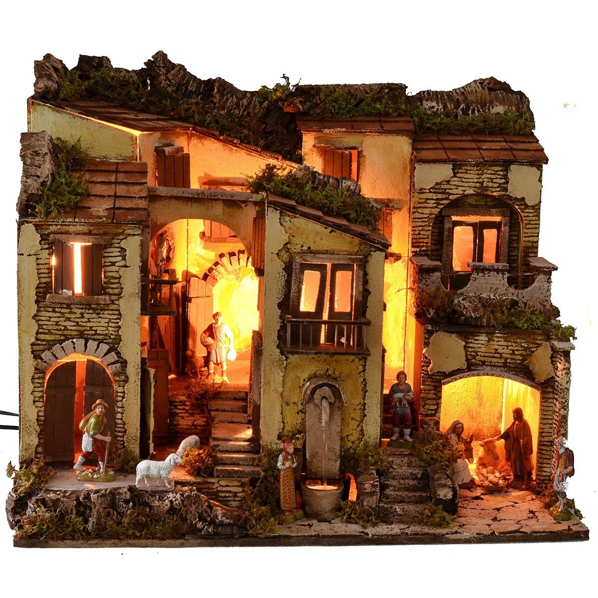 Illuminated artisan nativity scene in the classic-Neapolitan style, complete with Landi Moranduzzo statues and characterized by a functioning fountain complete with continuous water recycling pump. The scenography is well finished in detail: on the lower floor there is a space inside which statues of the Nativity Landi Moranduzzo are placed, 10 h cm high. In addition, still on the lower floor, there is a fountain running on electricity and a house with two entrances. Two stairways branch off from the center leading to the upper village, characterized by many houses all well finished with doors, balconies, windows and shutters. The current-operated lights that illuminate the landscape give a suggestive atmosphere. Furthermore, the use of moss and bark makes the landscape very realistic, as it is dense with green vegetation and surrounding rocky walls. Item entirely made in Italy by skilled artisan hands, using cork, wood and moss. We remind you that the 10 cm Landi Moranduzzo series has a real height of about 9 cm. It should also be noted that the number of the figurines will always remain the same as the photo, but the subjects could be replaced with others from the Landi Moranduzzo series according to the availability.