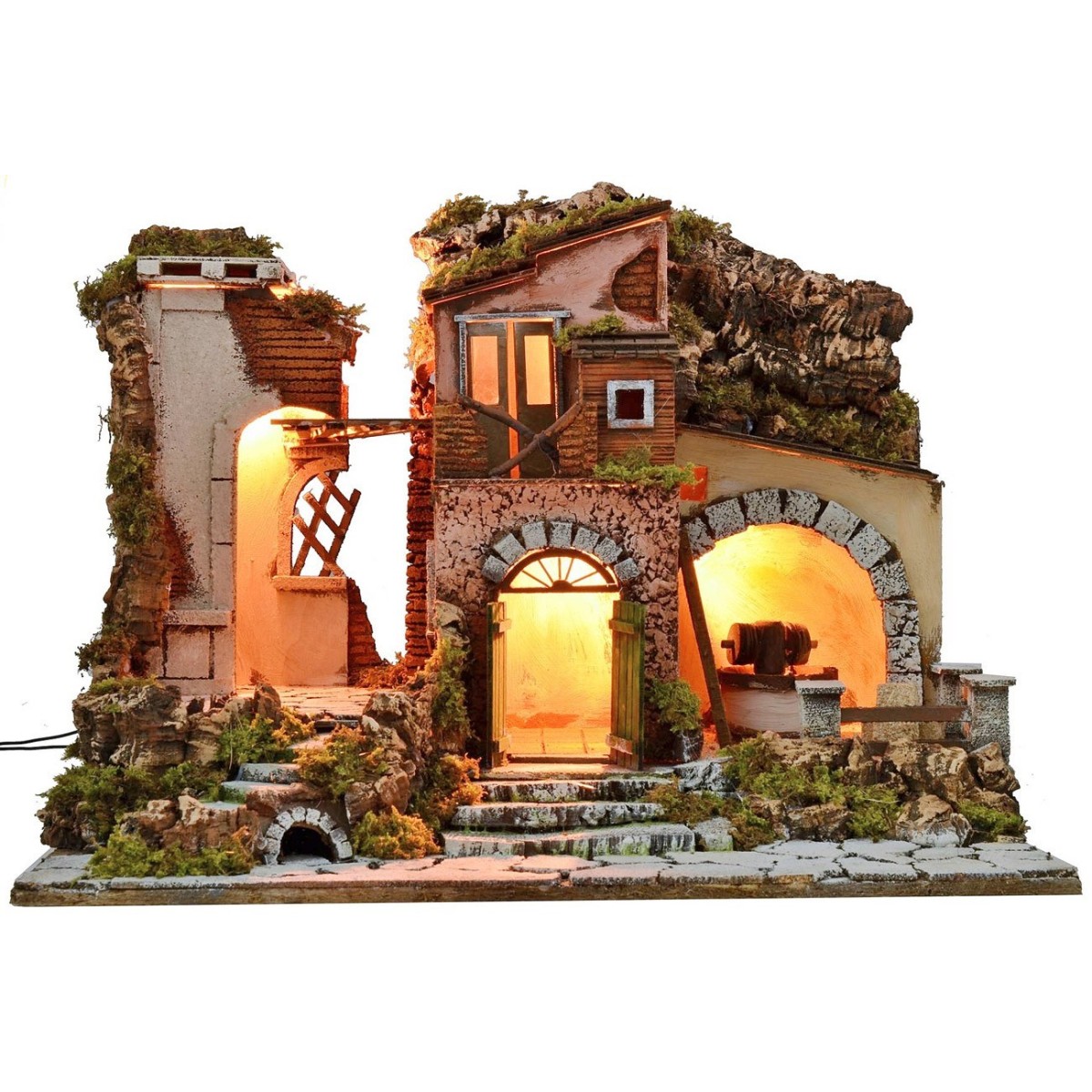 Illuminated artisan nativity scene in the classic-Neapolitan style, characterized by a moving millstone running on current. The scenography is well refined in the details: on the lower floor there is an area, sheltered by a veranda, where it will be possible to place Nativity statues with a recommended height of 10-12 h cm according to your tastes and preferences, some of which can be viewed in related products. Furthermore, still on the lower floor, there is a central house on two levels with an open double-leaf wooden door and an agricultural space where it is possible to see the rotating millstone in motion and well-kept small parts such as a staircase and some straw bales. . On the balcony of the house, which is located on the second floor, it is advisable to place statues 10 h cm high. The current-operated lights that illuminate the landscape give a suggestive atmosphere. Furthermore, the use of moss and bark makes the landscape very realistic, as it is dense with green vegetation and surrounding rocky walls. Item entirely made in Italy by skilled artisan hands, using cork, wood and moss.