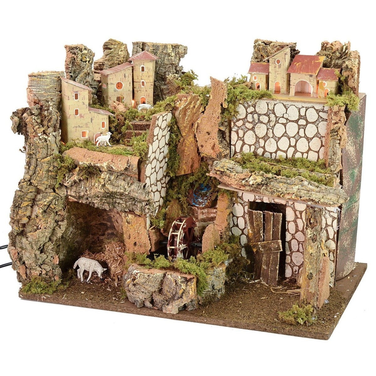 Presepe illuminato con cascata e mulino funzionante, il paesaggio montano è caratterizzato da terrazzamenti su diversi livelli che permettono di creare movimento ed enfatizzare l'effetto prospettico. Al centro, in primo piano si trova la cascata da dove sgorga l'acqua che fa girare il mulino, il movimento è dato da una pompa a riciclo continuo funzionante a corrente. A sinistra una grotta, mentre a destra davanti al portone di legno una pergola coperta in sughero, entrambi gli spazi possono essere utilizzati per collocare la Natività. Sulle alture si trovano tante casette e alcune pecorelle. Il Presepe fatto con legno sughero e muschio, è completo di luci alimentate a corrente.