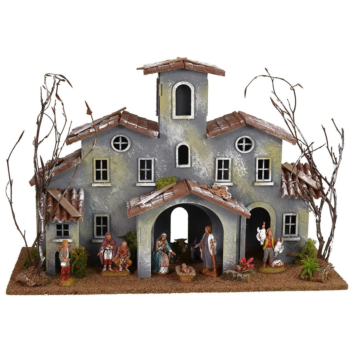 The article represents a pastel-colored eighteenth-century village with the farmyard in front complete with 6.5 cm Landi Moranduzzo figurines depicting the nativity scene and three 6 cm Landi Moranduzzo shepherds. On the facade of the building there are numerous windows, both round and rectangular, while on the sides there are two trees without leaves and decorative vegetation. The production materials of the object are wood, cork and moss. The Crib will be delivered with the same number of statues from the aforementioned series but the subjects could change depending on the availability of the moment.