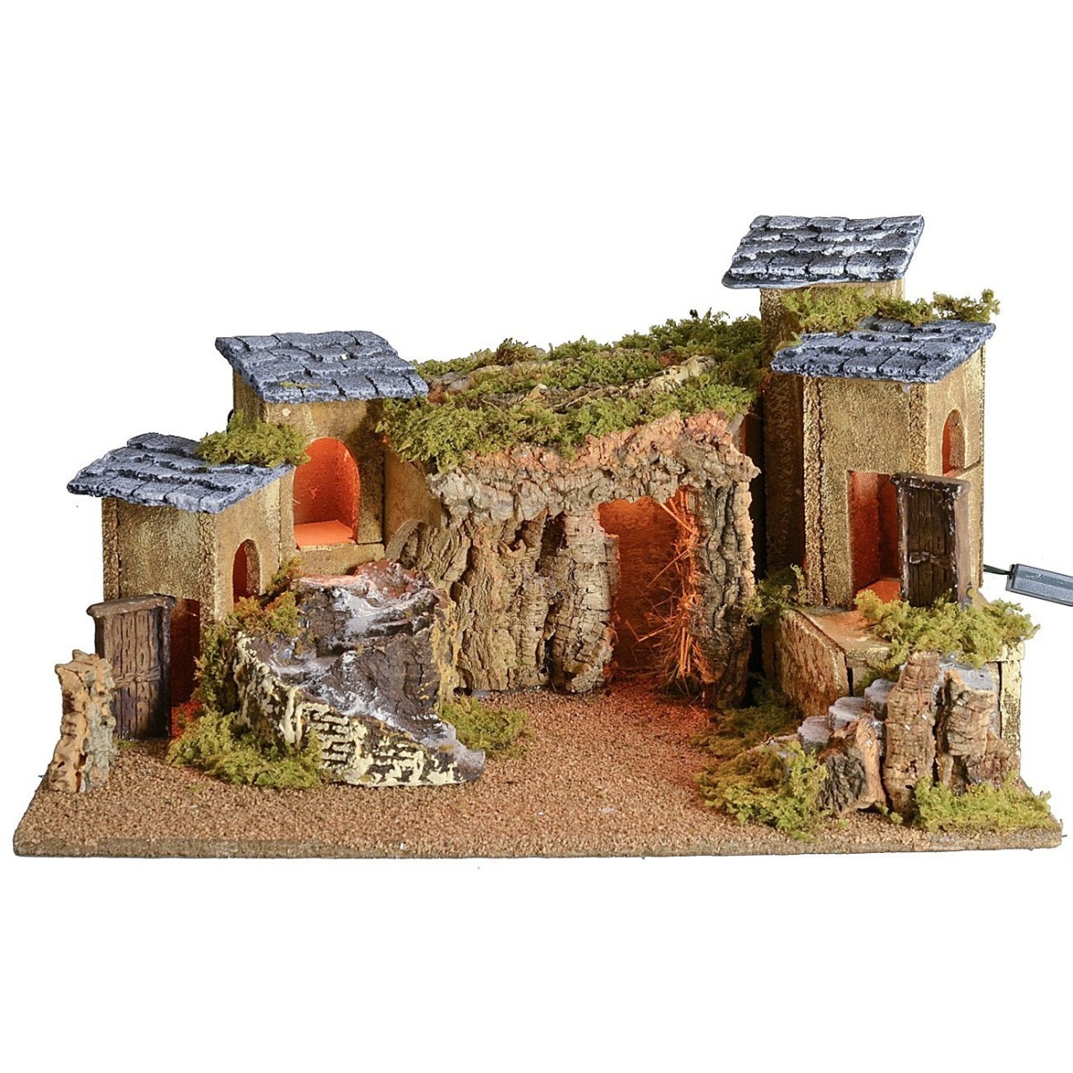 Presepe illuminato con casette ai lati dai portoni in legno e tetti chiari, al centro una grotta racchiusa tra pareti di sughero e muschio dove poter riporre la Natività di cm 10 . L'articolo è funzionante a corrente ed è consigliato per STATUE di altezza cm 10.