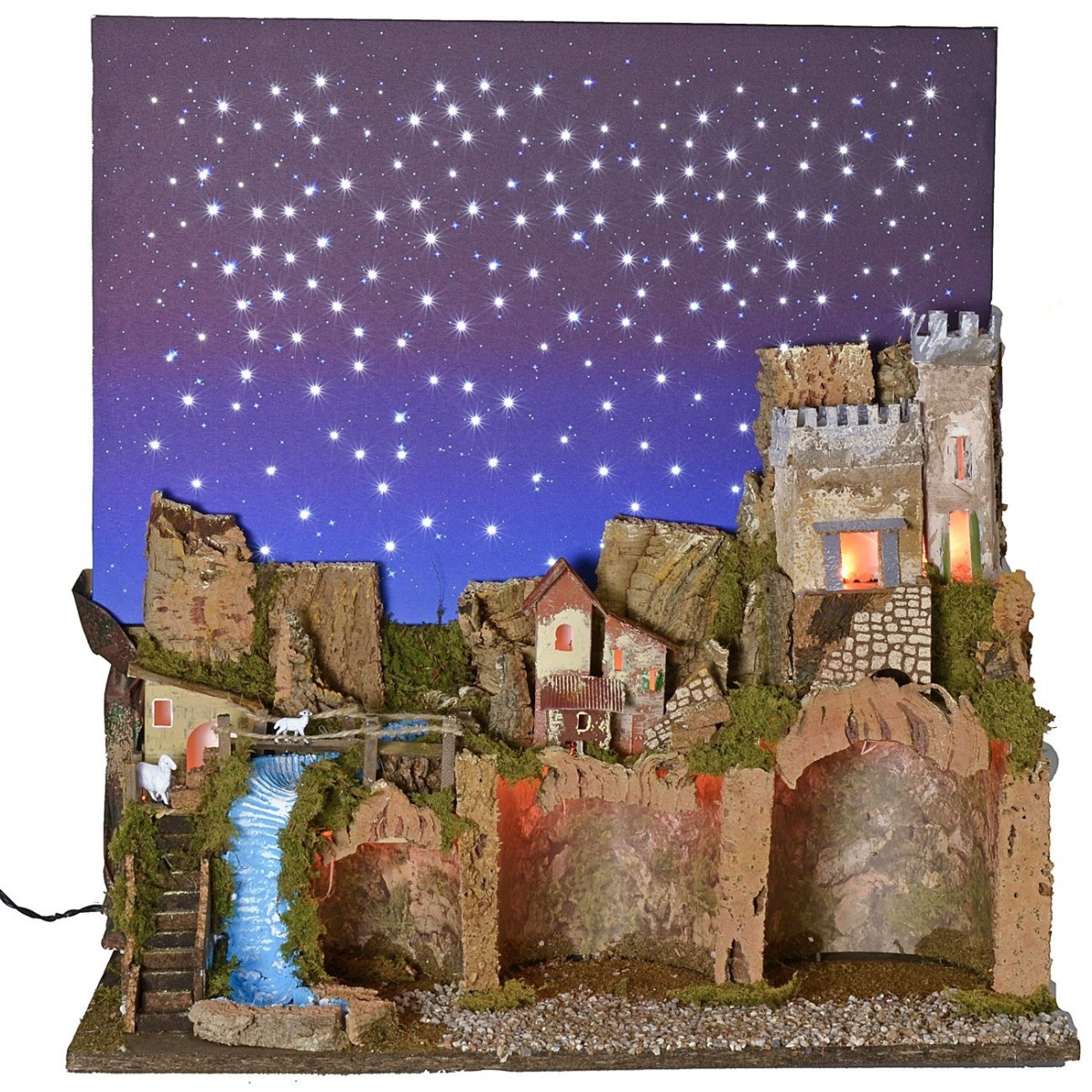 Illuminated nativity scene with fiber optic starry sky powered by batteries with touch ignition. The crib is made up of three caves of different sizes on the ground floor where you can place, for example, the Nativity or set up craft shops. On the left there is a stairway that leads to the terracing of the mountain where there are several illuminated houses and a castle on the top. The stairway is flanked by a dizzying waterfall, so the stream at the source is also visible, crossed by a wooden bridge with a sheep. The lighting makes this Nativity very impressive, the houses are powered by electricity, while the optical fibers of the sky run on batteries (3xAA not included). The article is recommended for statues with a height of 7-8 cm.