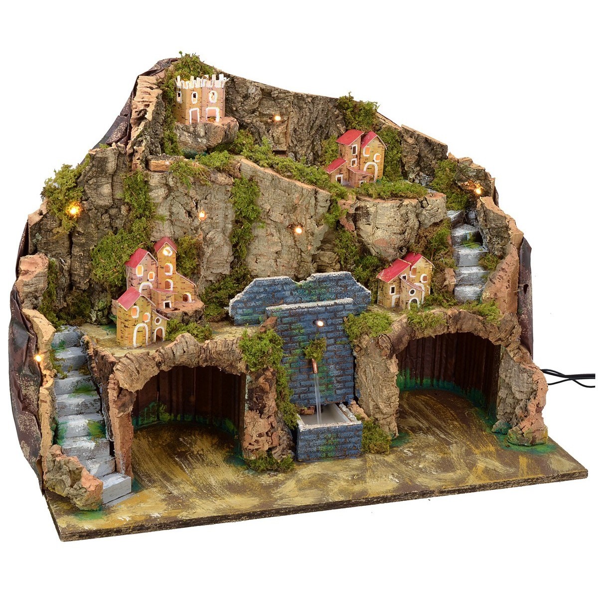 Presepe illuminato da led a luce bianca calda con fontana funzionante, paesaggio in lontananza e grotta. Il paesaggio montano è caratterizzato da terrazzamenti su diversi livelli che permettono di enfatizzare l'effetto prospettico delle casette in lontananza. Al centro, troviamo una fontana funzionante a corrente completa di pompa a riciclo d'acqua continuo. Sia a sinistra che a destra del prodotto troviamo due grotte dove poter collocare la Natività Landi Moranduzzo di altezza consigliata h 10 cm. Il presepe è stato realizzato artigianalmente da sapienti mani artigiane in Italia utilizzando il legno, sughero e muschio.