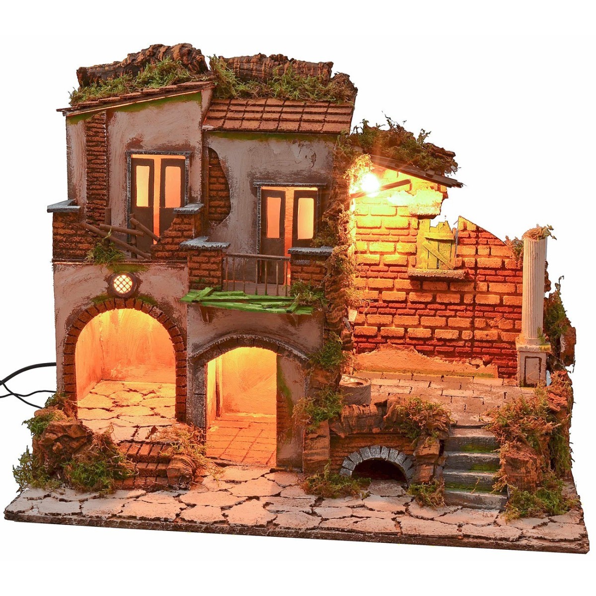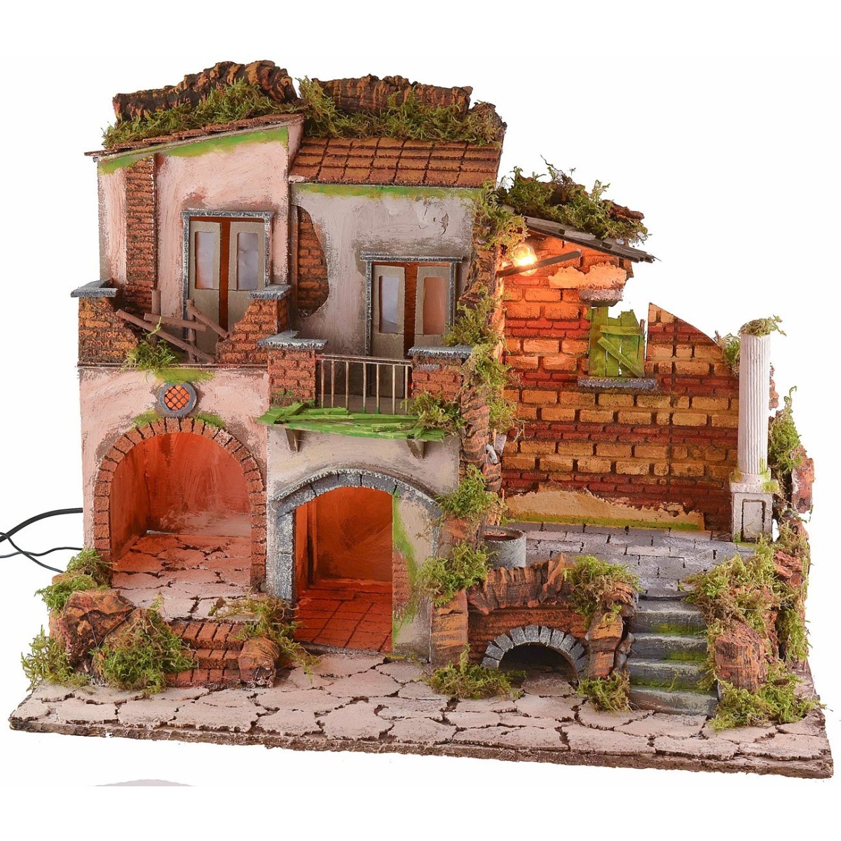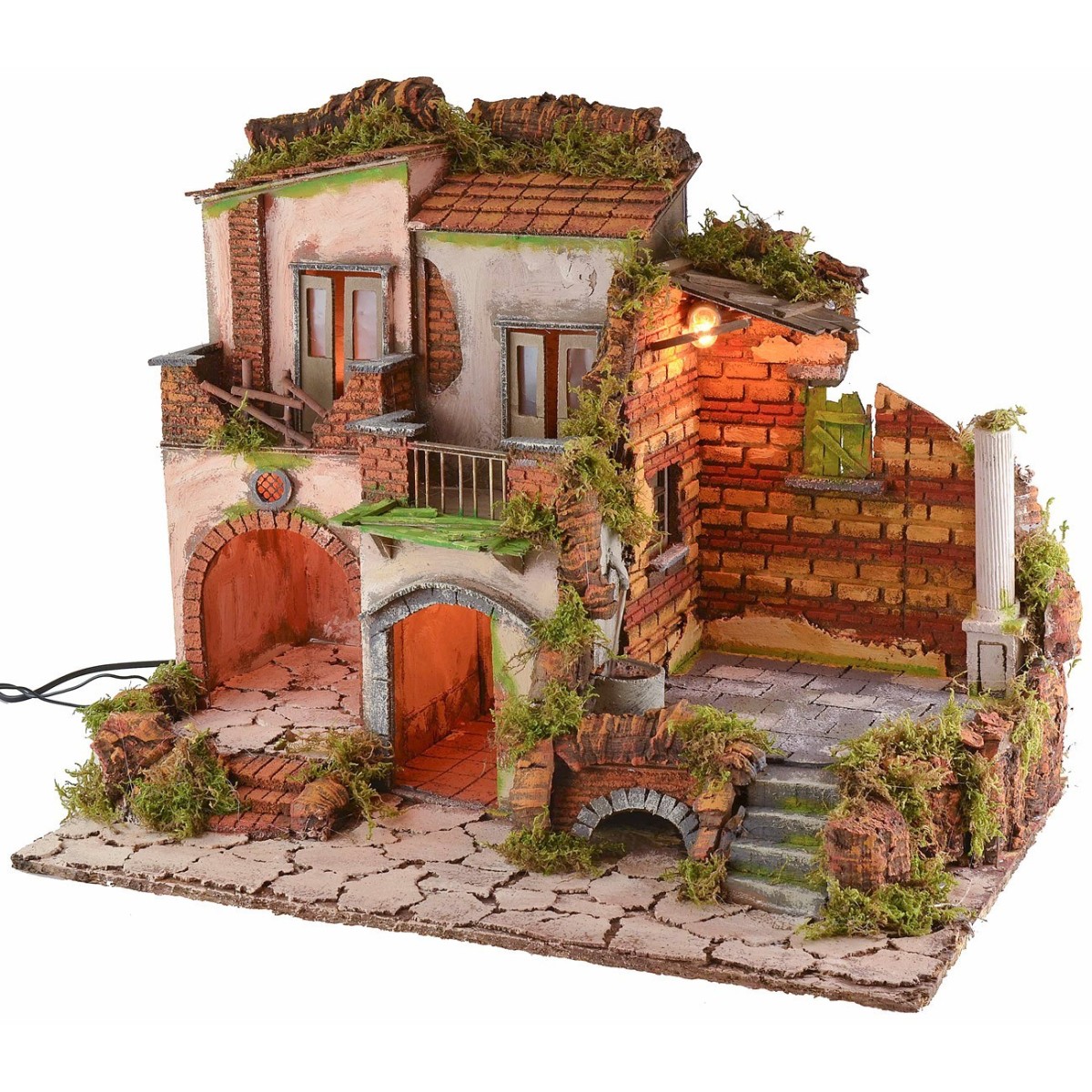 Borgo napoletano stile '700 illuminato e dotato di fontana, completa di pompa, funzionante a corrente. L' ambientazione è suddivisa in due piani, in quello inferiore ci sono due ampi porticati, dove si possono allestire delle botteghe, mentre in quello superiore sono presenti abitazioni dotate di balcone.L'articolo è stato prodotto da artigiani napoletani con legno, sughero e muschio. Si consiglia l'utilizzo di statue di altezza 10 cm.